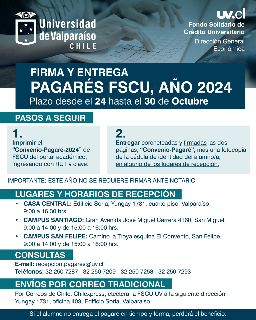 Para este proceso de firma de pagarés de FSCU, el administrador general del FSCU de la UV, Cristian Pérez Figueroa, proyecta que serán más de mil 500 estudiantes quienes contarán con este beneficio para el año académico 2024. Ellos y ellas deberán suscribir un convenio/pagaré de FSCU, firmándolo y entregando dicha documentación en las oficinas del FSCU, ubicadas en Yungay 1731, cuarto piso, Valparaíso, o en los lugares habilitados en el Campus San Felipe y en el Campus Santiago.