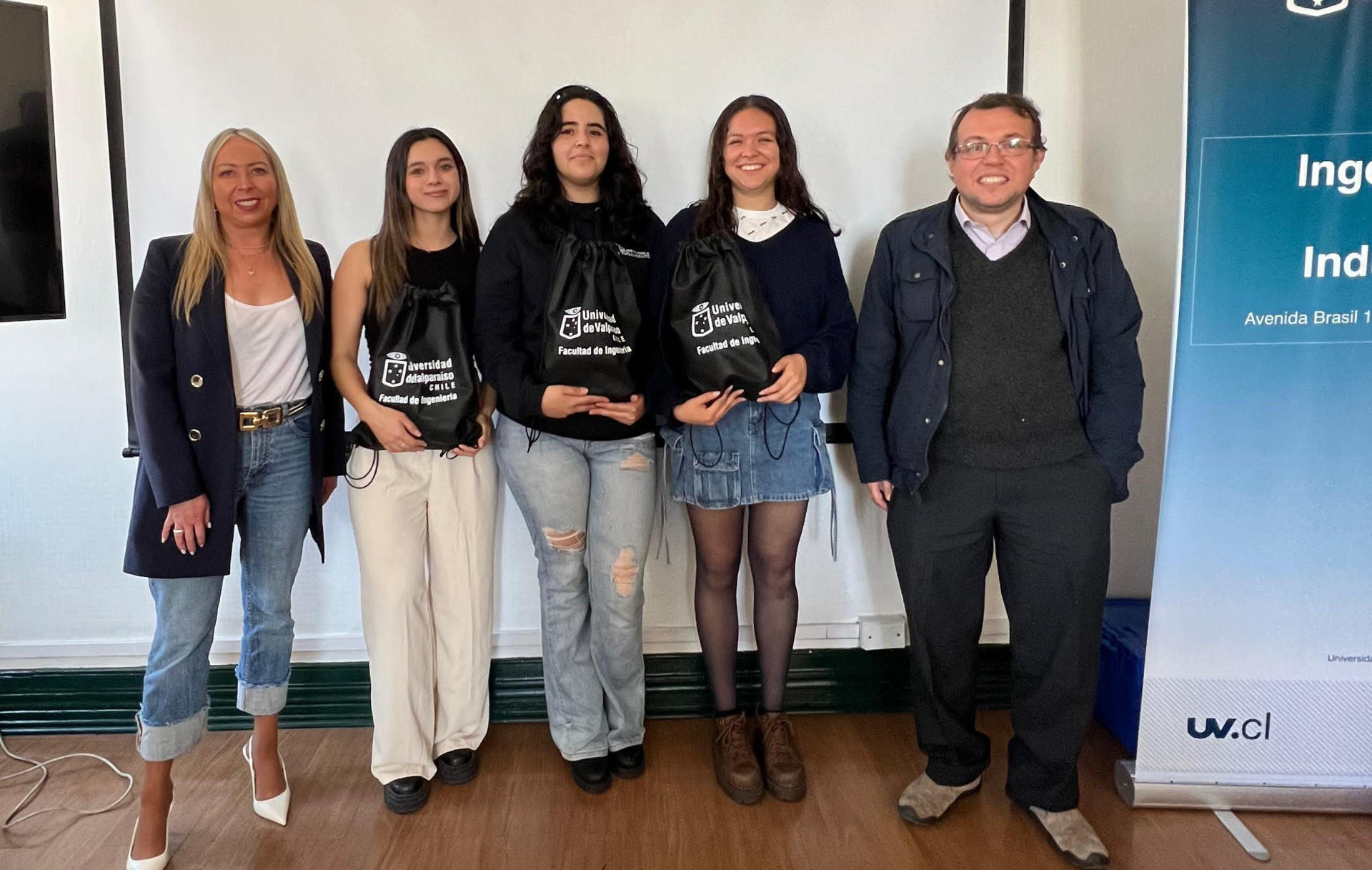 Danna Jiménez, Fernanda Pino y Montserrat Jorquera, de Ingeniería Civil Ambiental; Esteban Álvarez, de Ingeniería Civil Industrial, y Mariana Orozco, estudiante colombiana de intercambio, obtuvieron el segundo lugar nacional en Innovación en el Rally Latinoamericano de Innovación 2024. Con ese motivo, se reunieron con académicos de la Facultad de Ingeniería UV.