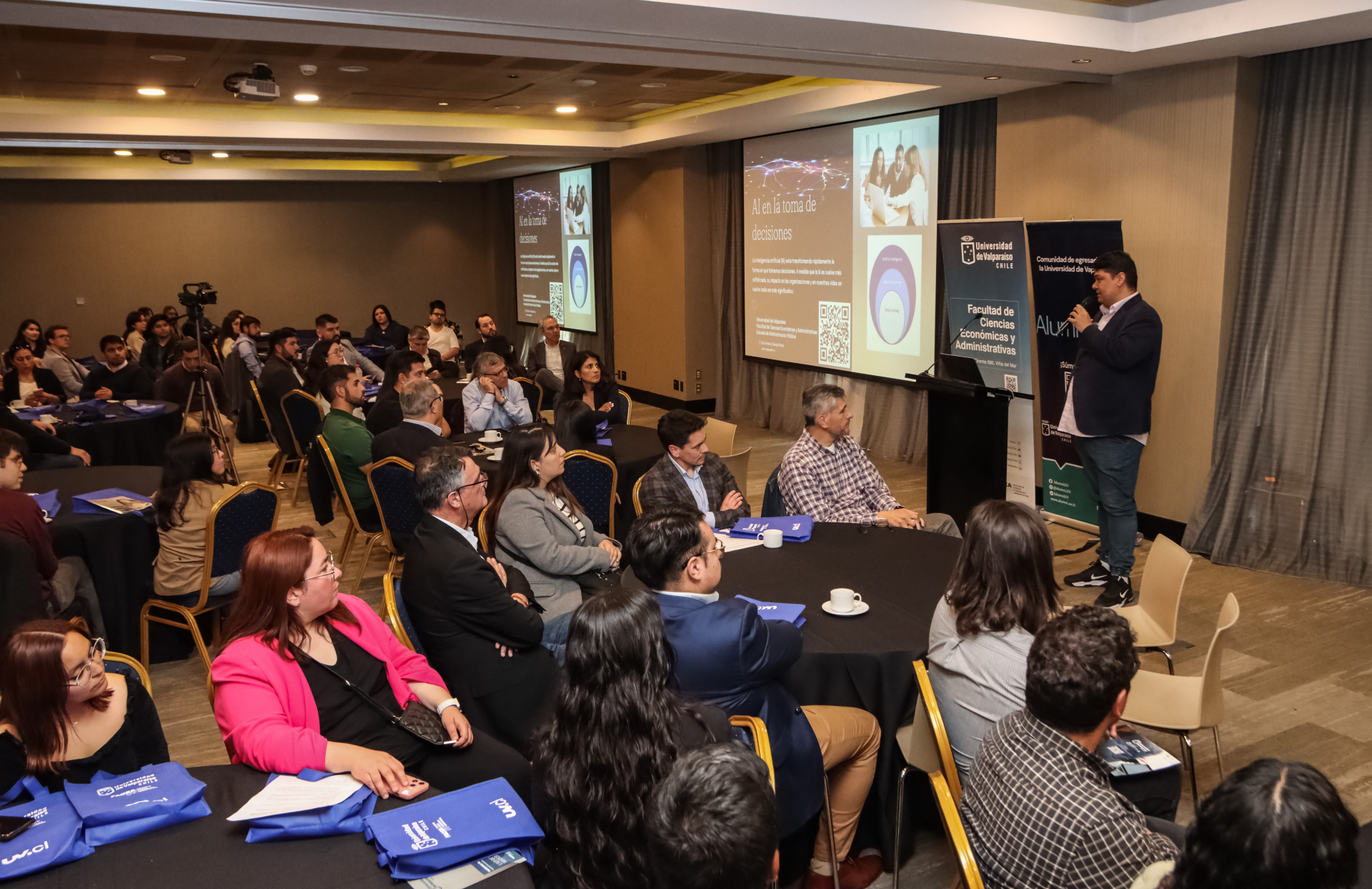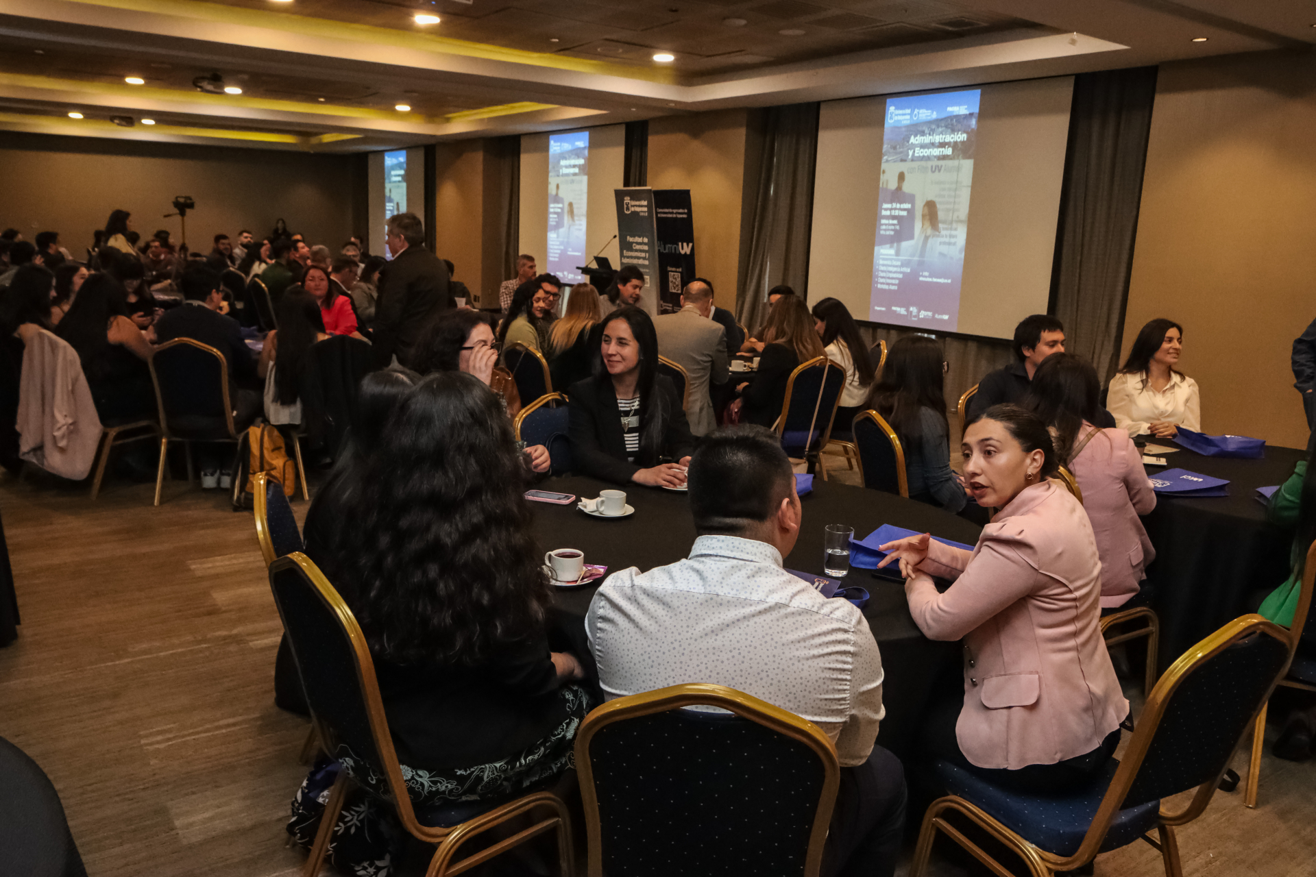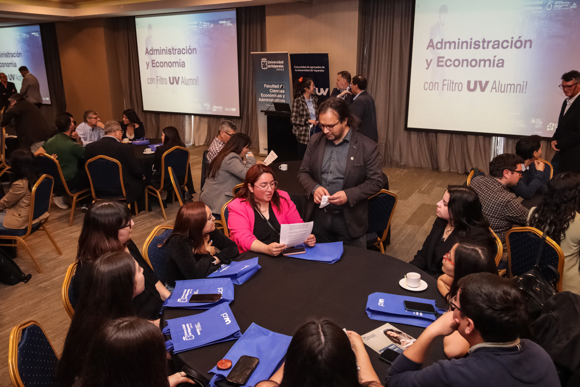 En los salones de Novotel de Viña del Mar, tuvo lugar el encuentro con exalumnos “Administración y Economía con Filtro UV Alumni”, organizado por la Facultad de Ciencias Económicas y Administrativas con el apoyo de Alumni UV y de la Dirección de Innovación y Transferencia Tecnológica de la UV (DITEC). La iniciativa —que contó con la asistencia de más de un centenar de invitadas e invitados, egresados y profesionales de las carreras de esa unidad académica— tuvo por objeto reunir a dos generaciones de alumnos para compartir y conversar acerca de distintos temas de interés, tales como Inteligencia Artificial, innovación y empleabilidad, además de confraternizar y fortalecer redes de apoyo entre los egresados y con la Universidad, promover programas de posgrado y generar vínculos útiles para una mejor inserción en el mundo del trabajo.