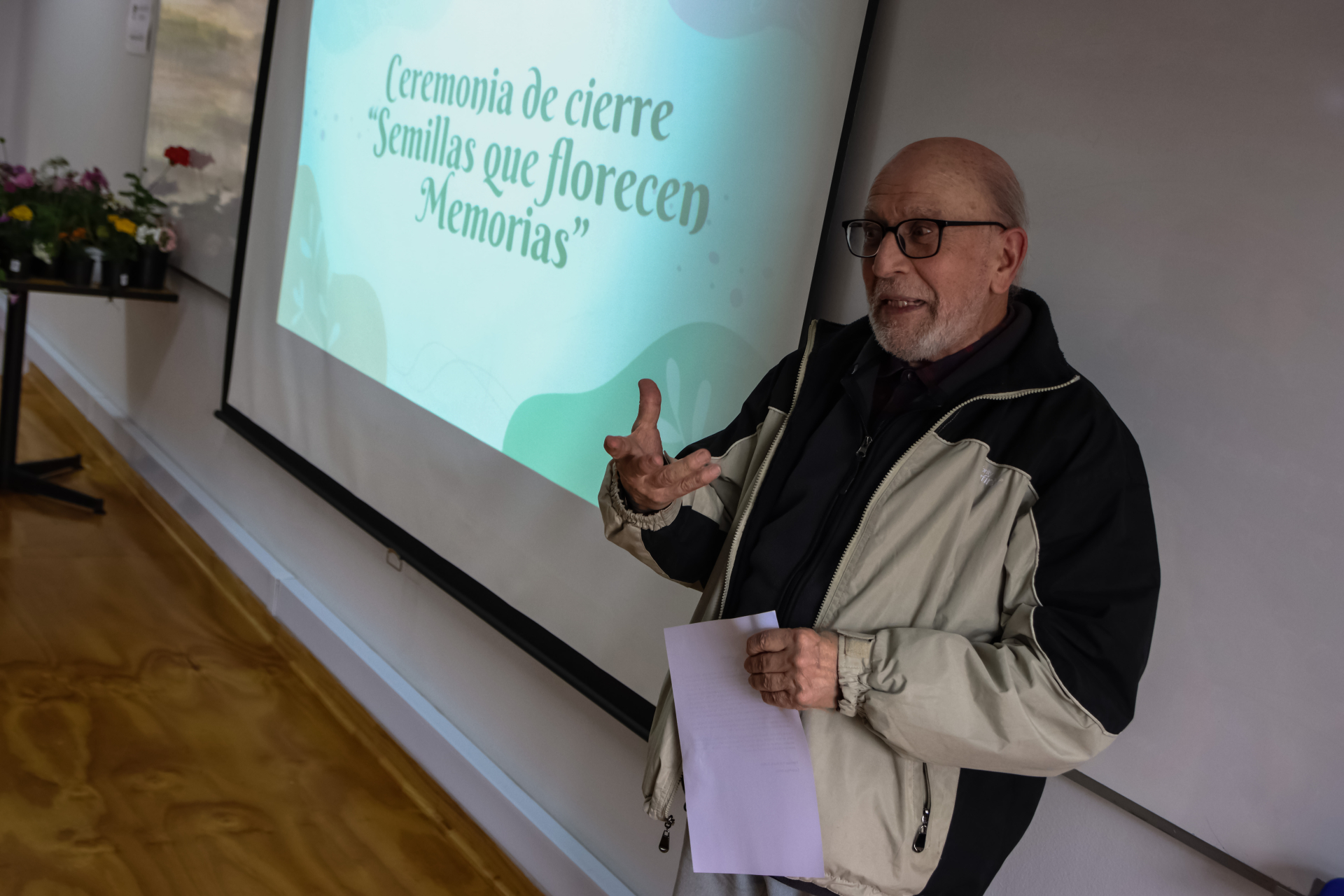 En la oportunidad, compartieron sus relatos Ema Rivera y Francisco Peña, mientras que Virginia Lazo entregó obsequios a las y los estudiantes a cargo del proyecto, así como a sus participantes. A su vez, las personas mayores recibieron sus certificados de participación y una planta en maceta para cada una.