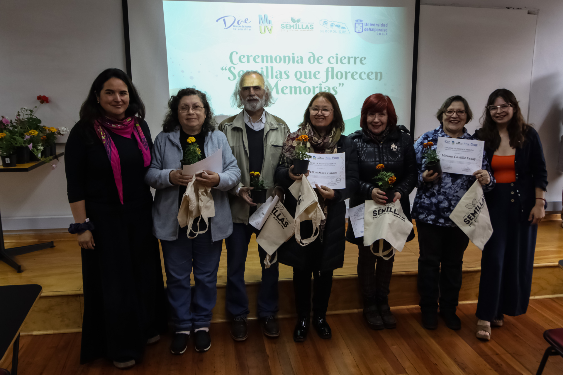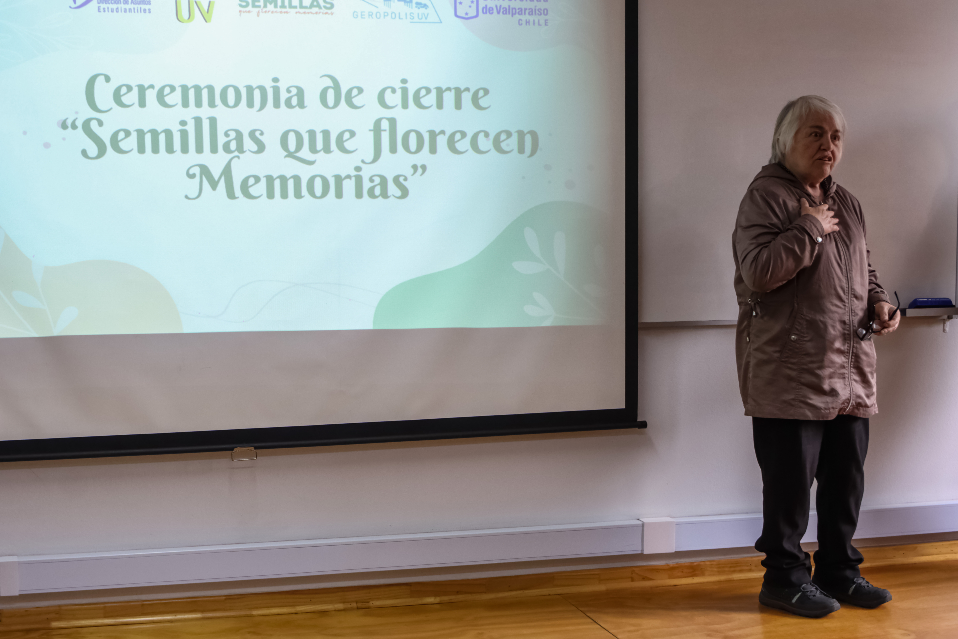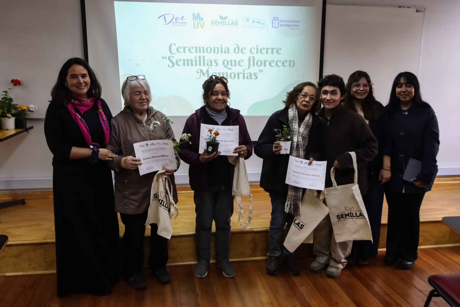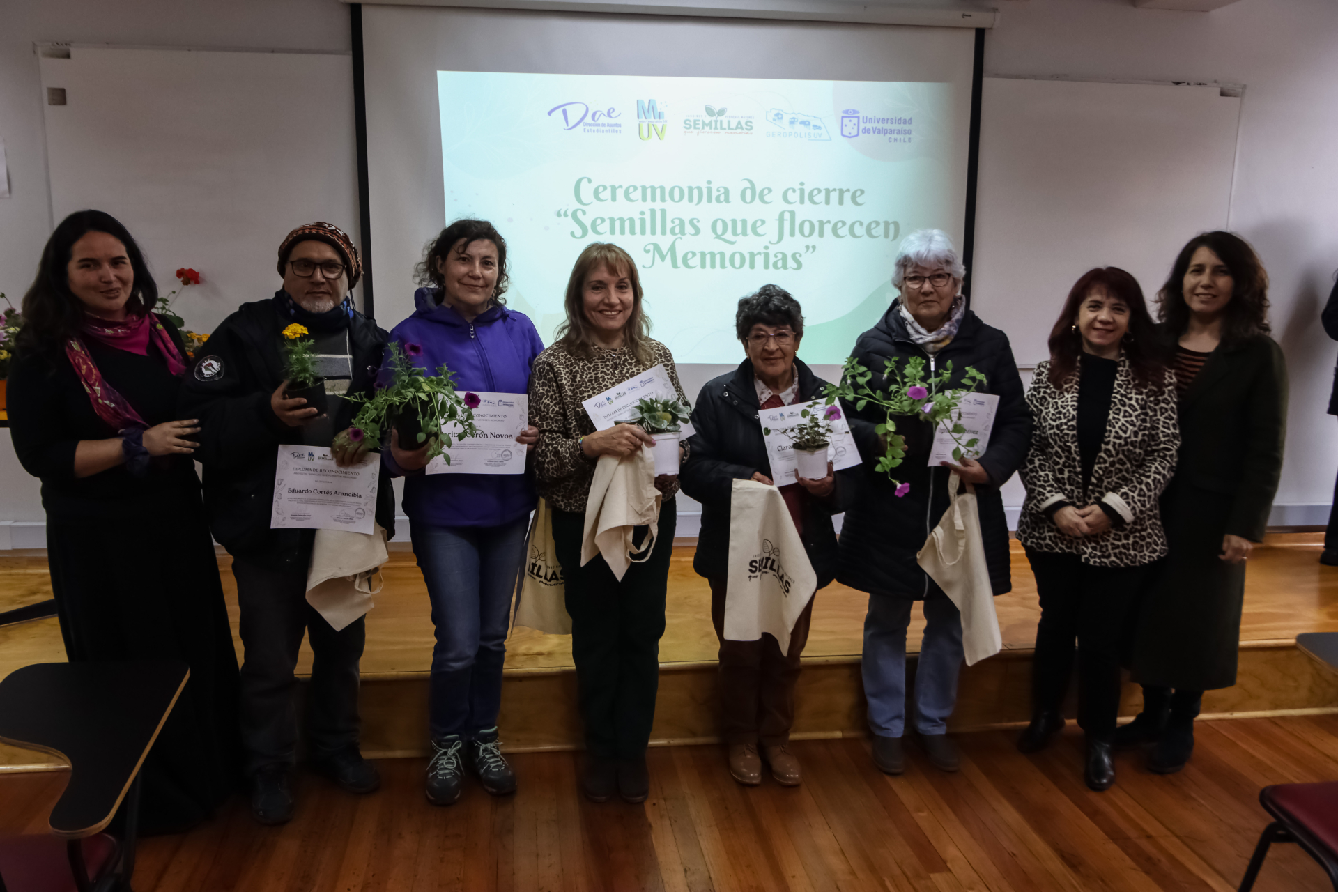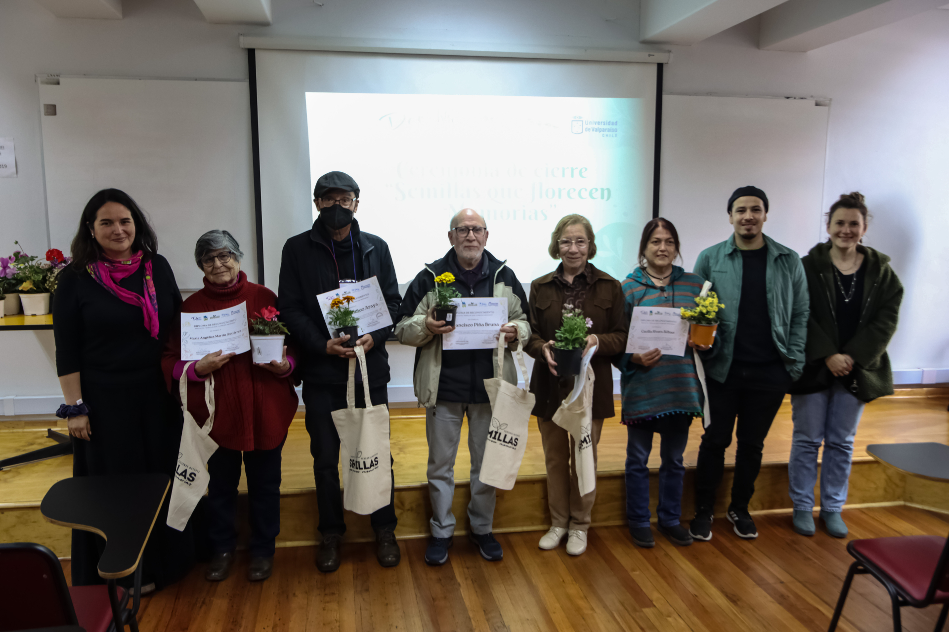 El acto contó con la presencia de las y los participantes en el proyecto, a quienes se sumaron Viviana García, directora del Centro Gerópolis; Daniela Jara, directora de la Escuela de Sociología; Mónica Iglesias, jefa de carrera de Sociología; Cecilia Concha, secretaria de Facultad de Ciencias Sociales; Javiera Basáez, trabajadora social de Gerópolis, y representantes de la Unidad de Medio Ambiente y Sostenibilidad, UMAS UV.