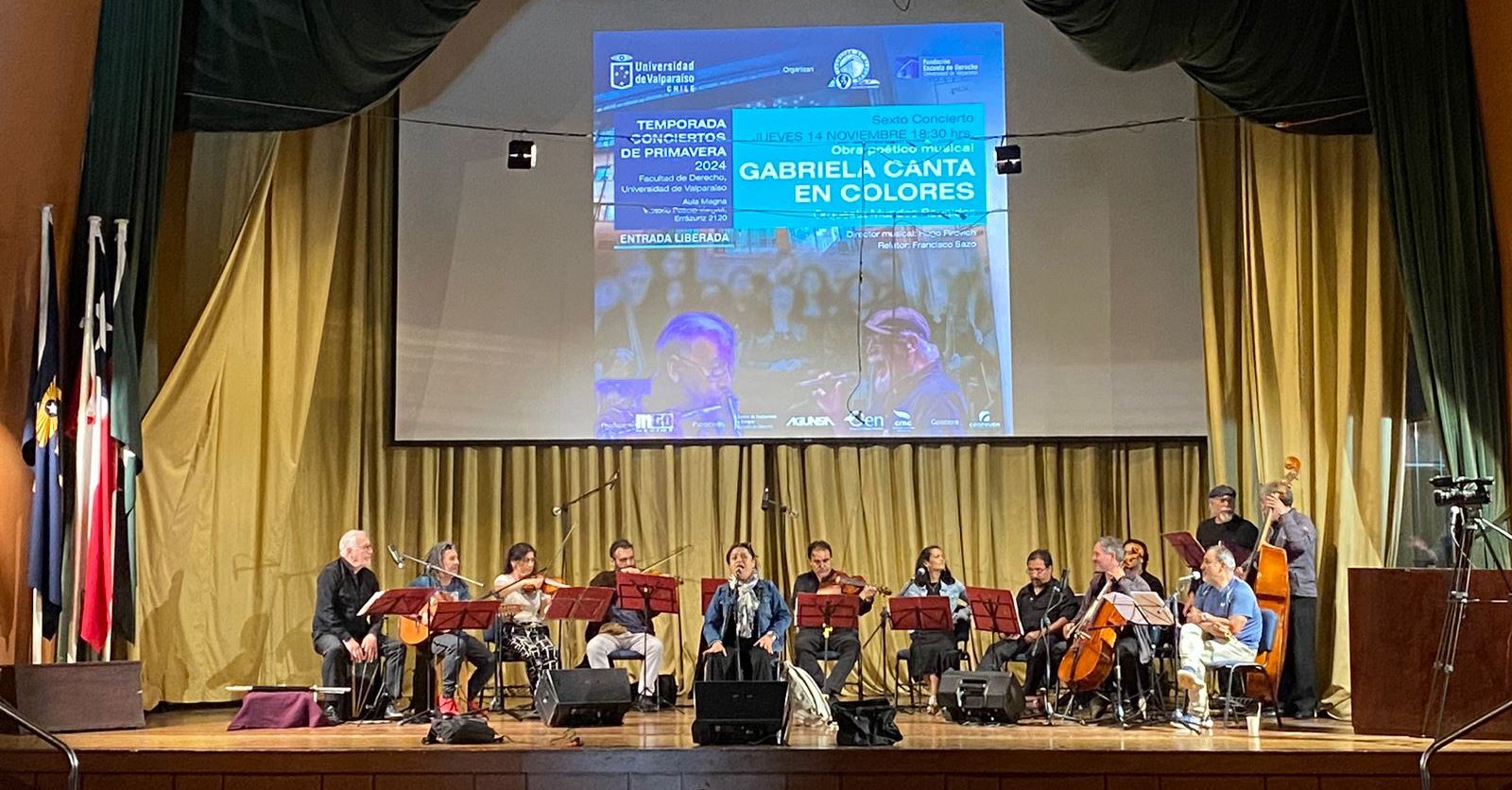 Con éxito se llevó a cabo la sexta jornada de la Temporada de Conciertos de Primavera 2024, organizada por la Facultad de Derecho y la Fundación Escuela de Derecho de la Universidad de Valparaíso, ocasión en que la Orquesta Mundos Reunidos presentó el programa “Gabriela canta en colores”. La obra poético musical incluyó el relato de poemas de Gabriela Mistral, con la participación de Francisco Sazo en los textos de enlace entre poemas; Gonzalo Valencia, como relator, y Hugo Pirovich en la dirección de la agrupación. Destacó además el uso de distintos instrumentos, como quinteto de cuerdas moderno, teclado, guitarra, cuatro venezolano, charango, ronroco, cajones peruanos, melódica, flauta dulce y flauta traversa.