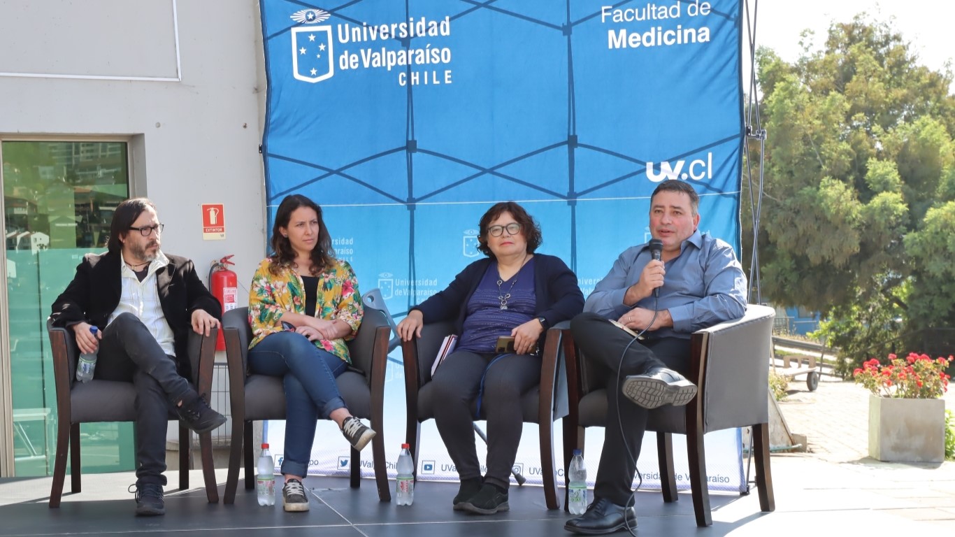La VII Jornada de Investigación de la Facultad de Medicina de la UV consideró en primer término un conversatorio en el que participaron el director del Centro Interdisciplinario de Investigación Biomédica e Ingeniería para la Salud (MEDING), Rodrigo Salas; la directora del Centro Interdisciplinario de Investigación Territorial (CIISTE), Ana Zepeda; la directora del Centro de Investigación del Desarrollo en Cognición y Lenguaje (CIDCL), María Francisca Alonso, y el director suplente del Centro para la Investigación Traslacional en Neurofarmacología (CITNE), Pablo Muñoz. Las presentaciones de cada uno de ellos fueron introducidas y moderadas por el decano Antonio Orellana.