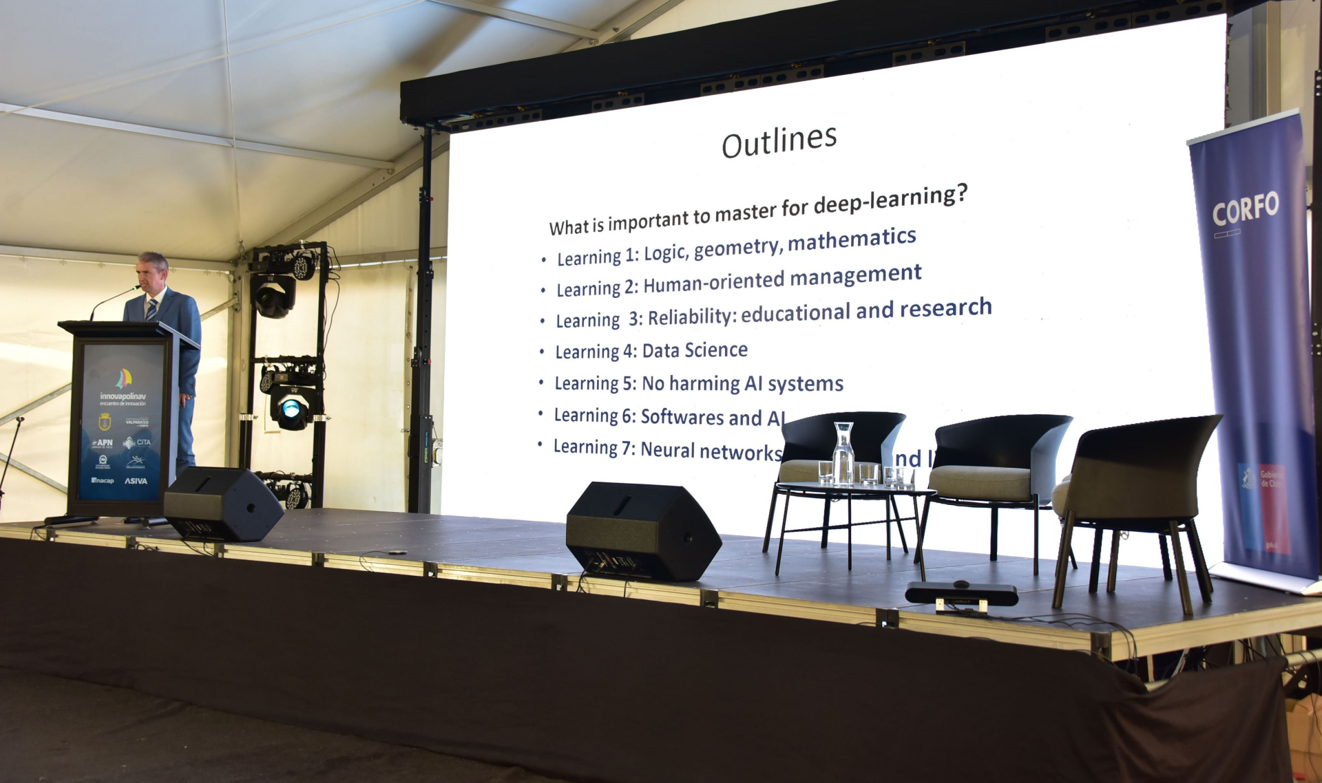 En esa línea, el doctor Milán explicó que “mi conferencia tuvo como objetivo proporcionar una base educativa integral, que permita a los estudiantes abordar y gestionar los desafíos de comprender y practicar el aprendizaje profundo. Para ello incorporé siete elementos clave para el éxito: lógica, geometría, matemáticas, gestión orientada al ser humano, confiabilidad, ciencia de datos, sistemas de IA no dañinos, software e IA, y redes neuronales, explorando tanto sus horizontes como sus límites. Presenté estas áreas con ejemplos concretos de mi investigación e integré descubrimientos recientes de nuestro Proyecto ANID ‘Exploración GRT-AC: una herramienta basada en regulación genética global para modelar la próxima generación de sistemas integrados de silicio biológico 2022', junto al también codirector del proyecto, doctor Alejandro Dinamarca del Cent ro de Micro-Bioinnovación, Escuela de Nutrición y Dietética, Facultad de Farmacia, Universidad de Valparaíso. Mi intención fue ofrecer esta charla como una interfaz útil para inspirar la motivación y proporcionar temas principales para que los estudiantes aprendan activamente y mejor la ciencia de datos, con un enfoque particular en redes neuronales y nuestra visión de “Futuro del Aprendizaje: Aulas Inteligentes“, que era el nombre de la sección en la que participé“.
