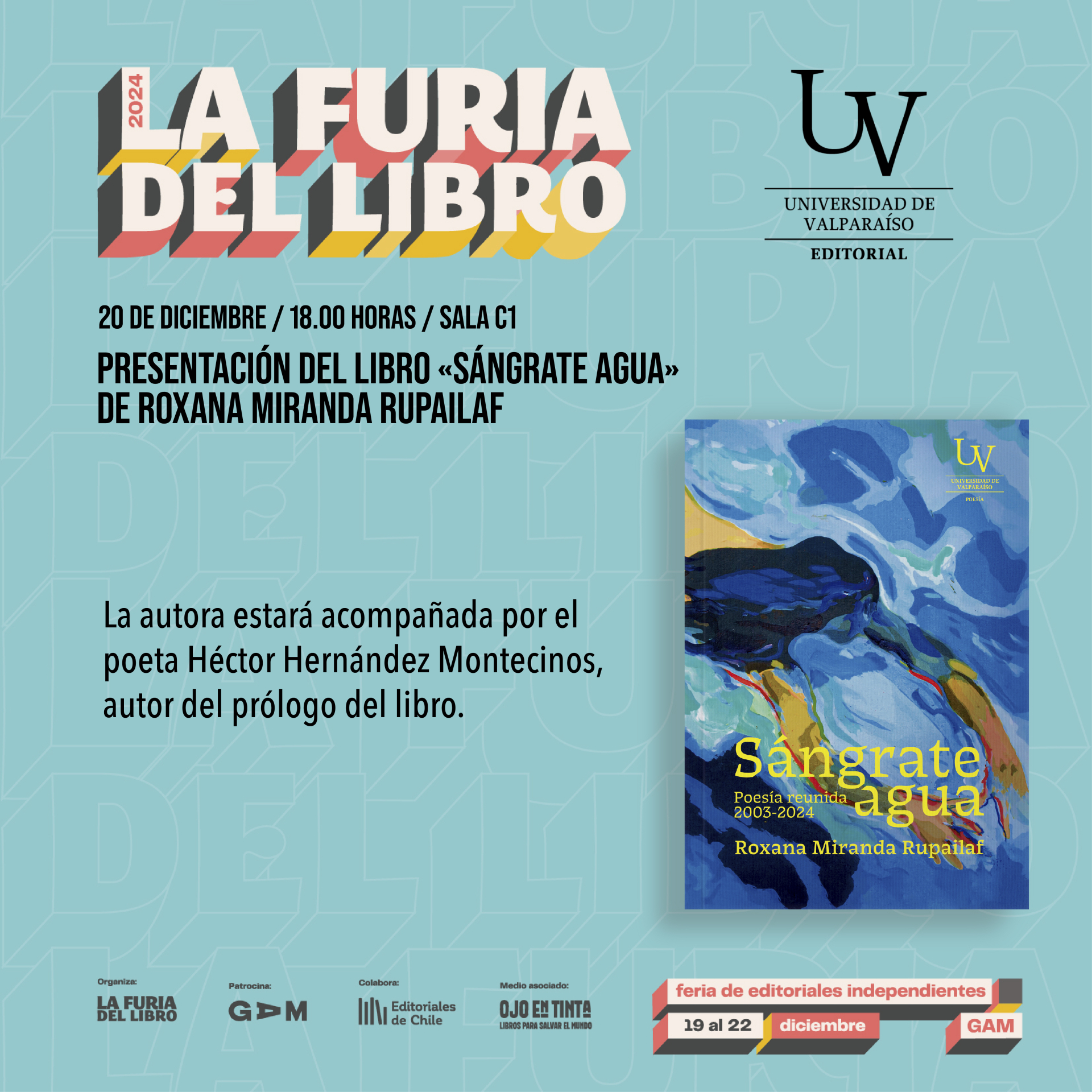 Este viernes 20 de diciembre, a las 18:00 horas, se realizará una lectura y conversación con la poeta mapuche huilliche Roxana Miranda Rupailaf, que presentará el libro «Sángrate agua. Poesía reunida (2003-2024)», recientemente publicado por Editorial UV.