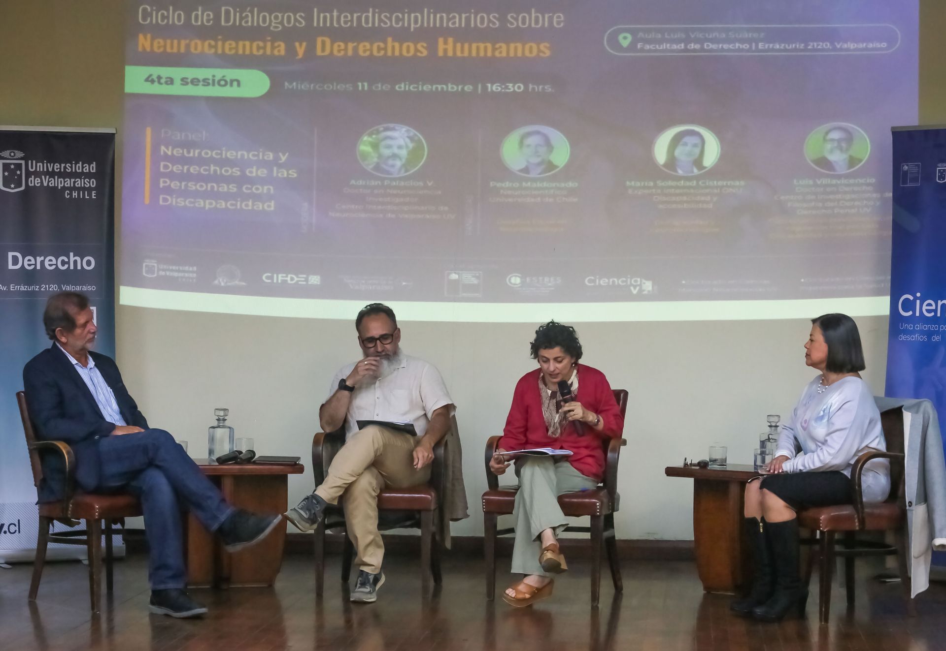 En esta cuarta sesión, especialistas en la materia dialogaron sobre la temática “Neurociencia y derechos de las personas con discapacidad”, y en ella expusieron Pedro Maldonado, profesor del Departamento de Neurociencias de la Facultad de Medicina de la Universidad de Chile; María Soledad Cisternas, experta internacional ONU Discapacidad y Accesibilidad, y Luis Villavicencio, profesor y director del CIFDE UV. La jornada fue moderada por Alejandra Zúñiga, profesora de la Escuela de Derecho UV.