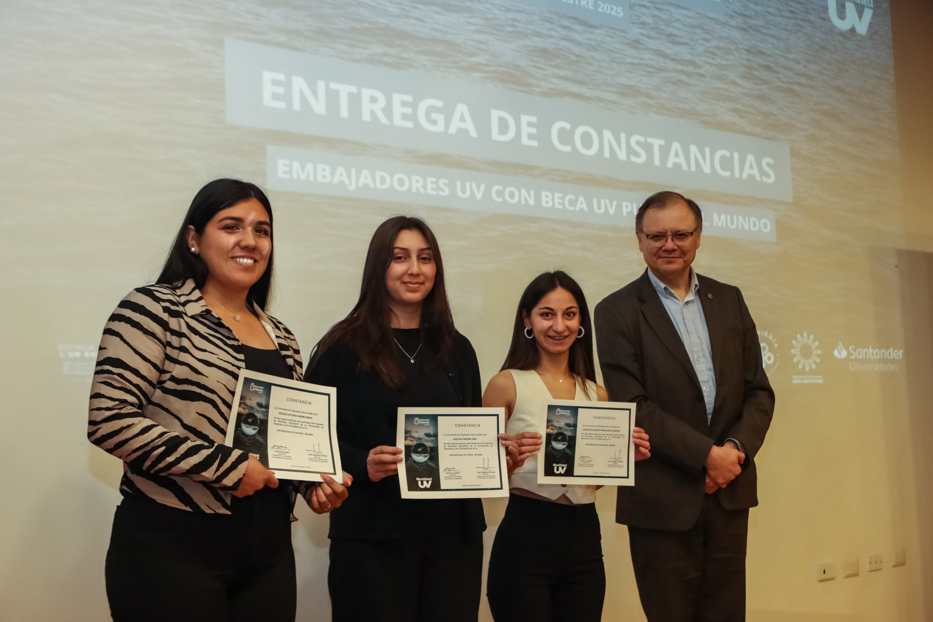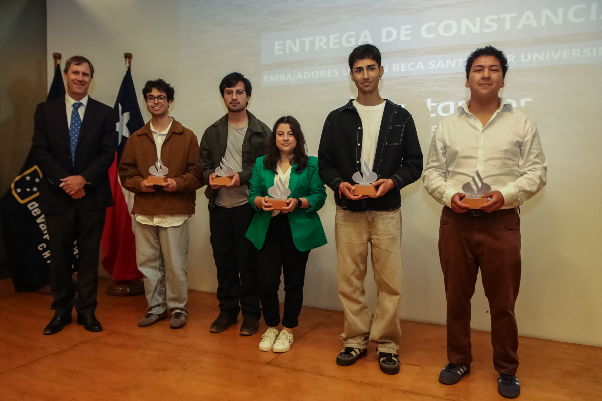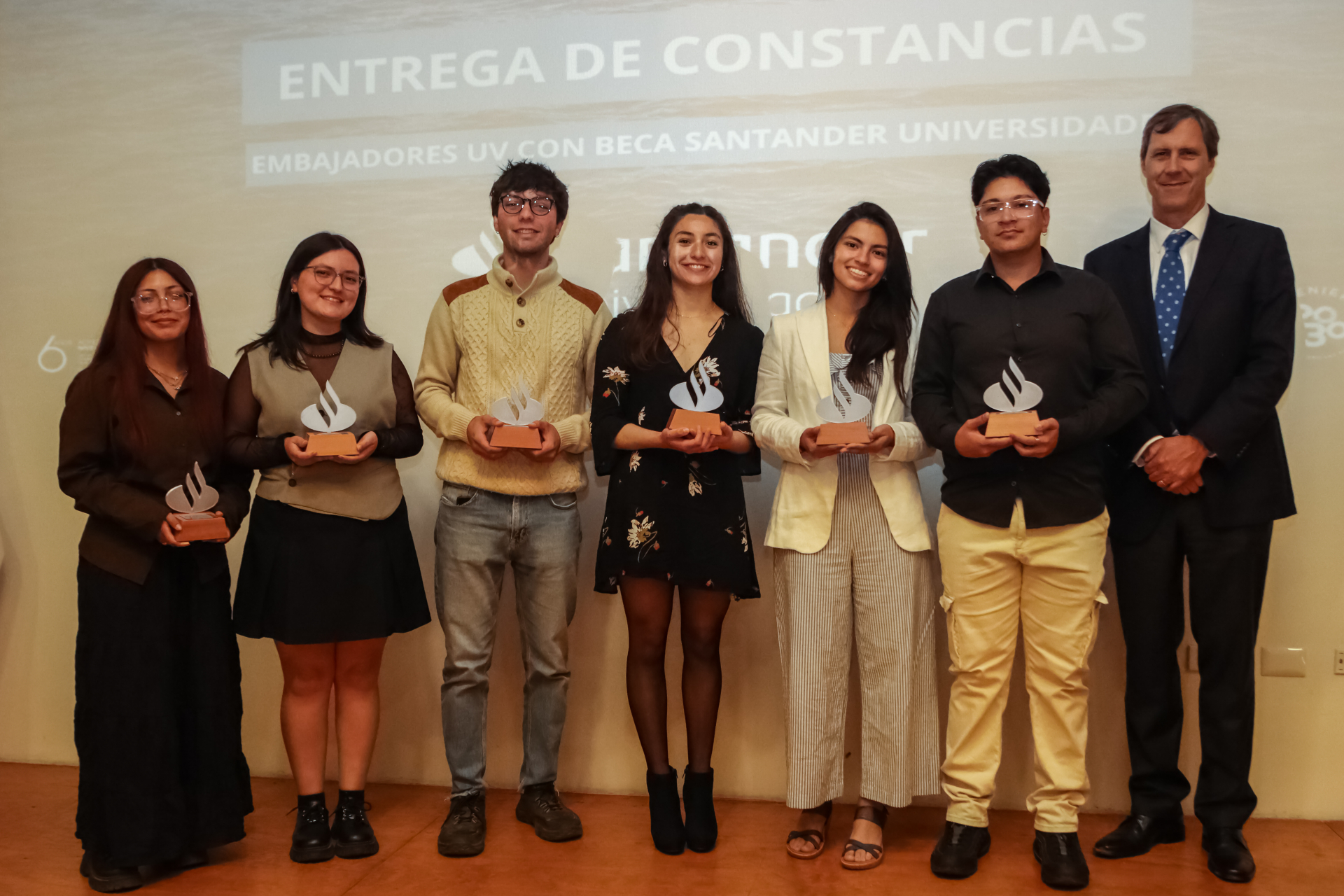 El acto fue encabezado por el rector de la UV, Osvaldo Corrales, quien estuvo acompañado de Sebastián Bunster, gerente de Santander Universidades; Benjamín Barros, director de Relaciones Institucionales y Emprendimiento de Santander Universidades; Stefania González, ejecutiva de Santander Universidades, y Carlos Lara, vicerrector de Vinculación con el Medio de la UV. Asistieron también directivos centrales y representantes de las Facultades y Escuelas, así como familiares, amigas y amigos de las y los estudiantes.