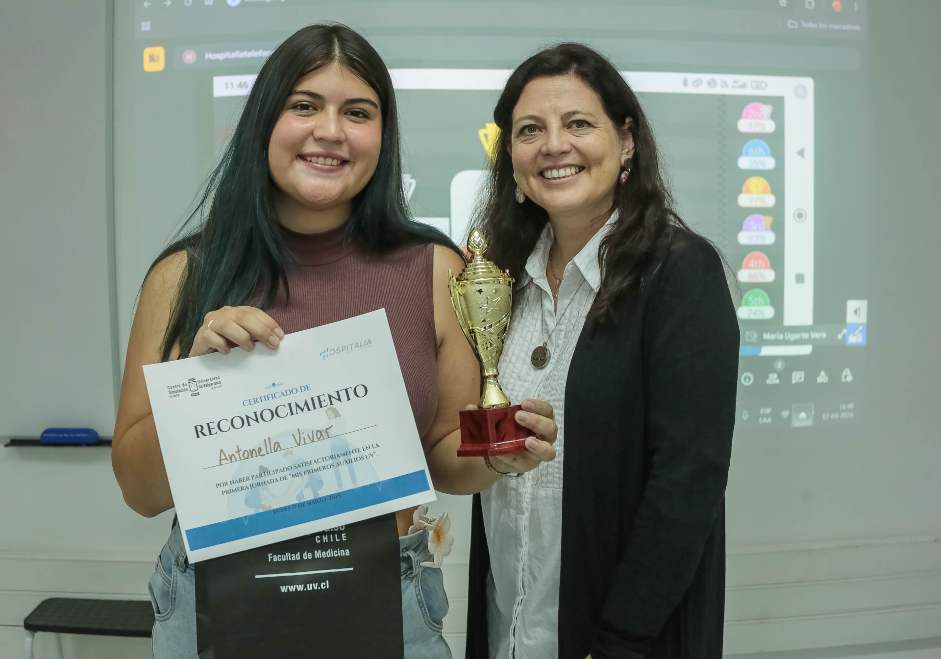 “Esta fue una actividad de primeros auxilios para mechones, que en su gran mayoría no están familiarizados con esta maniobra, y que concebimos para fomentar su autocuidado, fortalecer su autoestima y prepararlos desde ya, mediante un aprendizaje efectivo, para ayudar a otras personas en caso de una emergencia. Se trata de la primera vez que implementamos algo de este estilo, a modo de competencia, y lo hicimos en colaboración con Hospitalia, que nos facilitó un software especialmente diseñado para evaluar la ejecución en línea de la RCP”, explicó la coordinadora académica del SIMUV de la Facultad de Medicina, sede Reñaca, Macarena Ugarte.