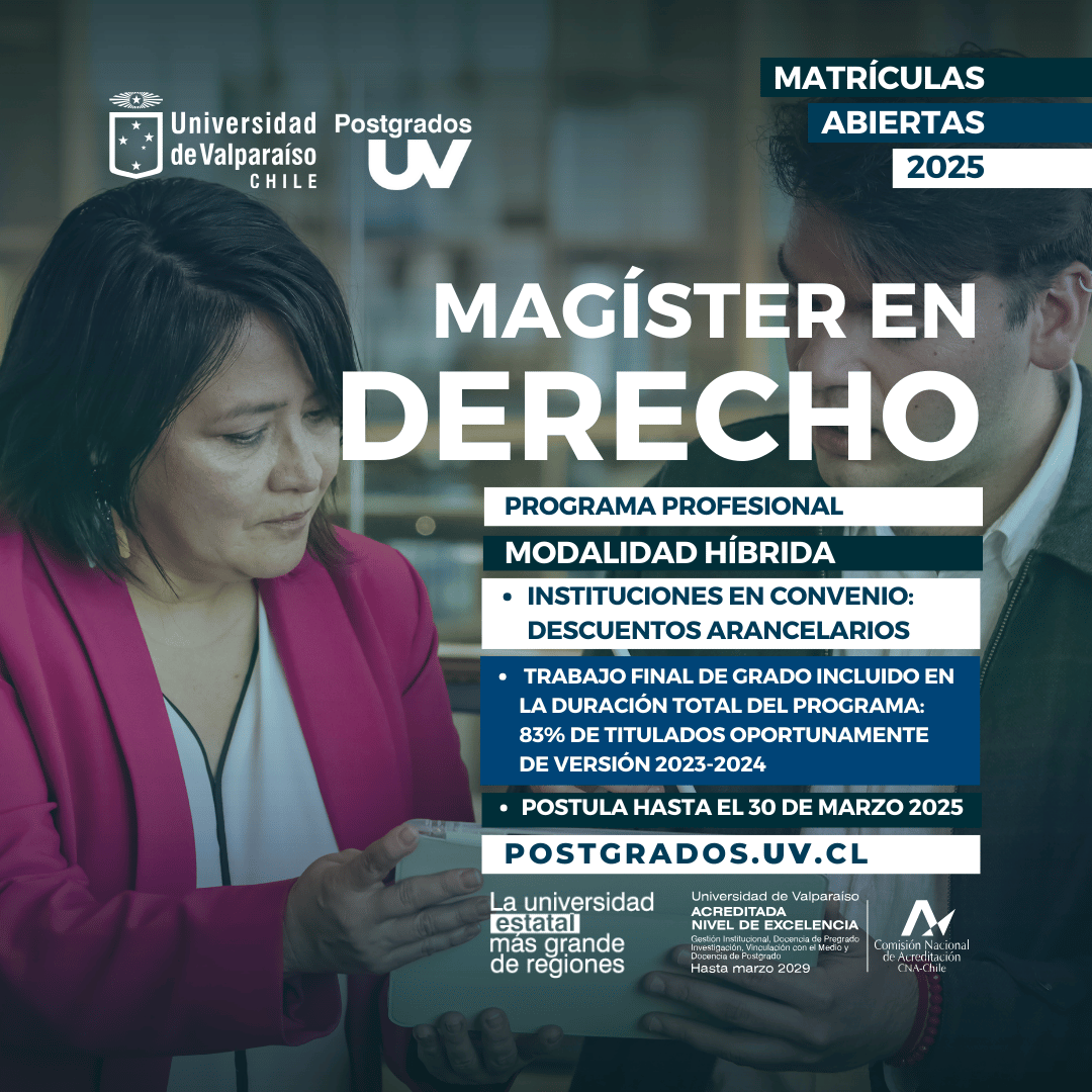 Las postulaciones al programa de Magíster en Derecho de la Universidad de Valparaíso finalizan el domingo 30 de marzo, y se realizan a través de la plataforma de Postgrados de la UV: https://postgrados.uv.cl/.