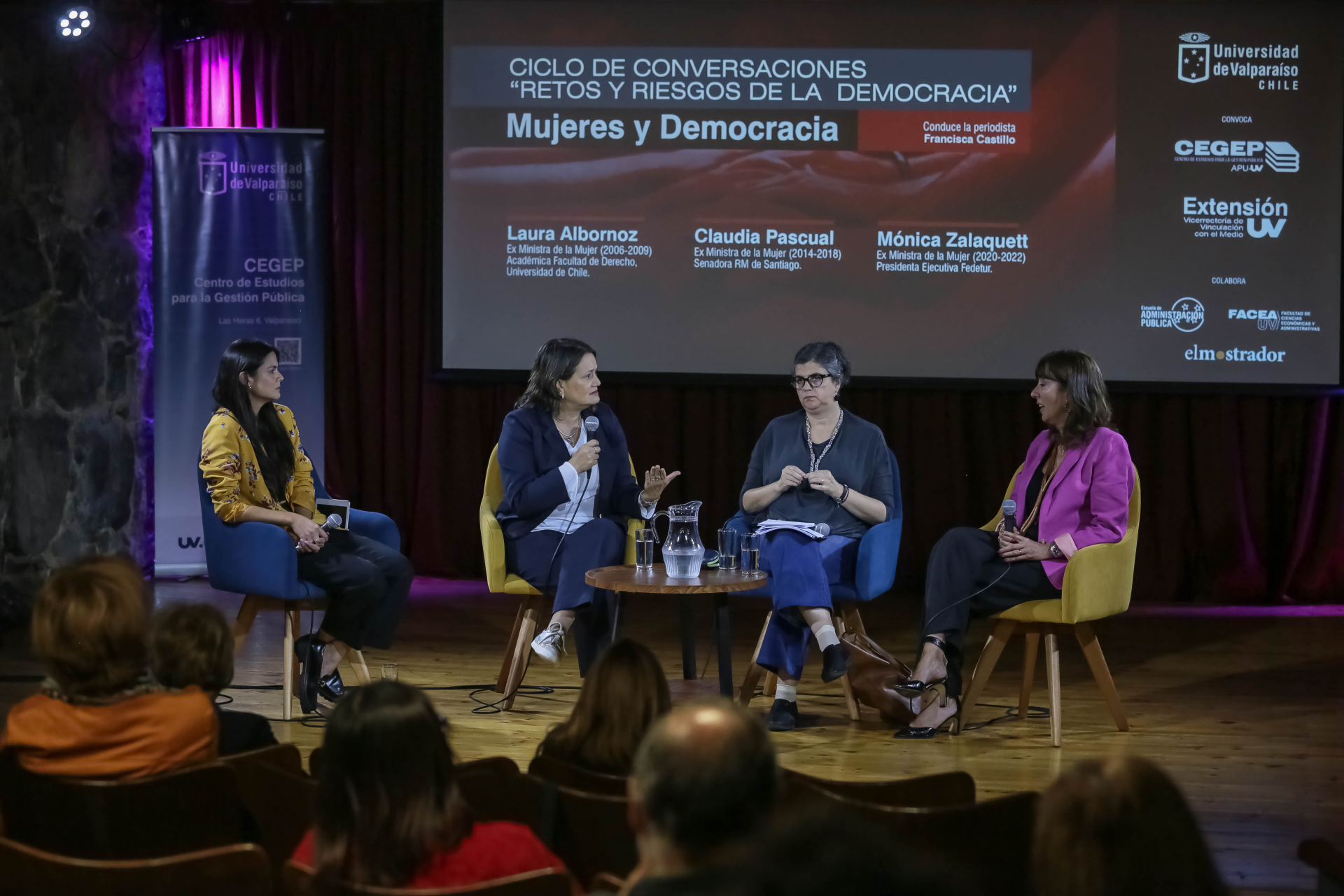 Las exministras de la Mujer y Equidad de Género, Laura Albornoz, Verónica Zalaquett y Claudia Pascual, participaron este jueves 27 en el conversatorio “Mujeres y democracia”, organizado por el Centro de Estudios de la Gestión Pública (CEGEP) de la Escuela de Administración Pública de la Universidad de Valparaíso, en el marco del reinicio del ciclo “Retos y riesgos de la democracia”.