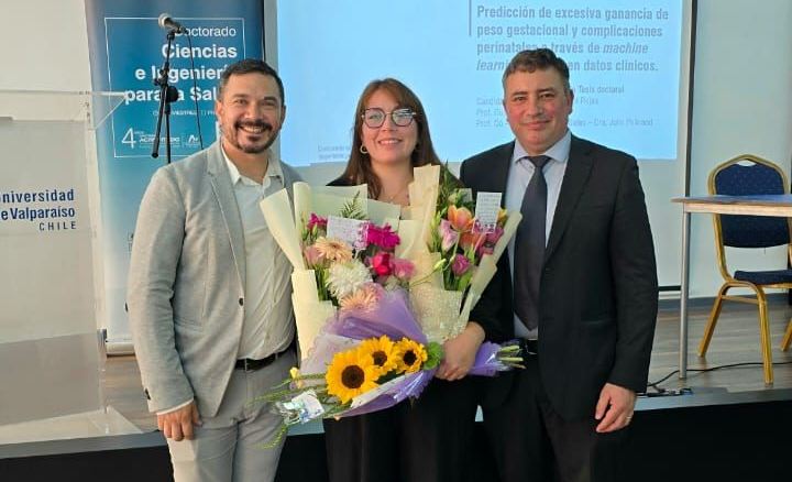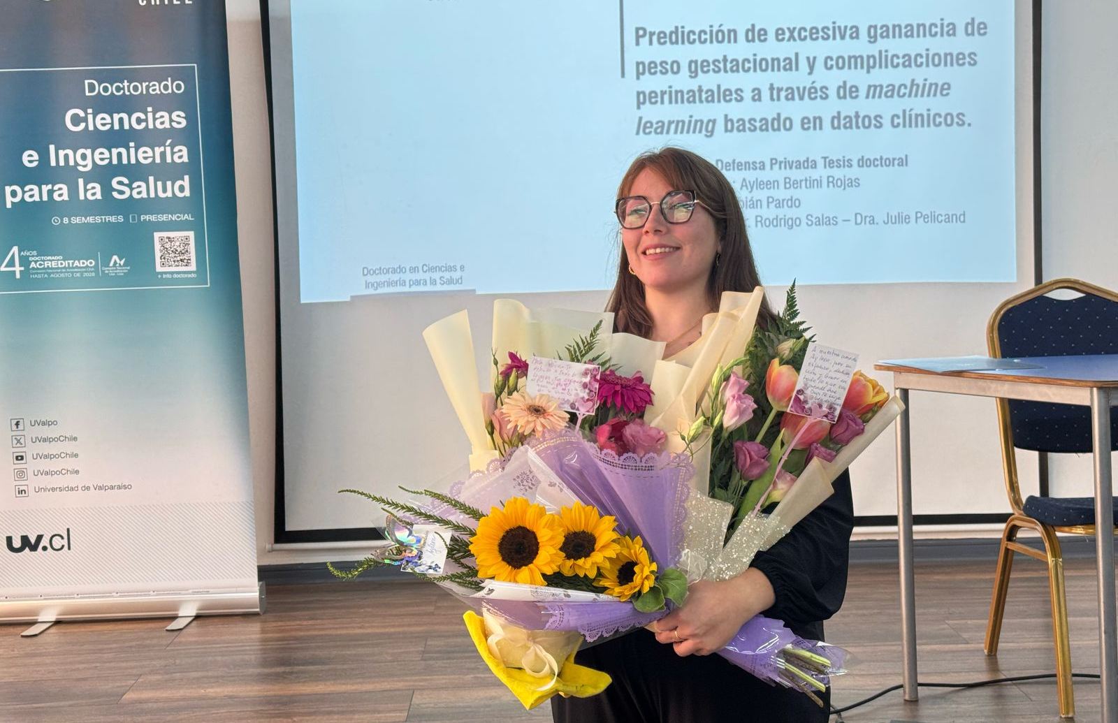Nutricionista titulada en la Universidad de Valparaíso, Ayleen Bertini se convirtió en la primera mujer en titularse del Doctorado en Ciencias e Ingeniería para la Salud UV, luego de la defensa de su tesis "Predicción de excesiva ganancia de peso gestacional y complicaciones perinatales a través de machine learning, basado en datos clínicos".