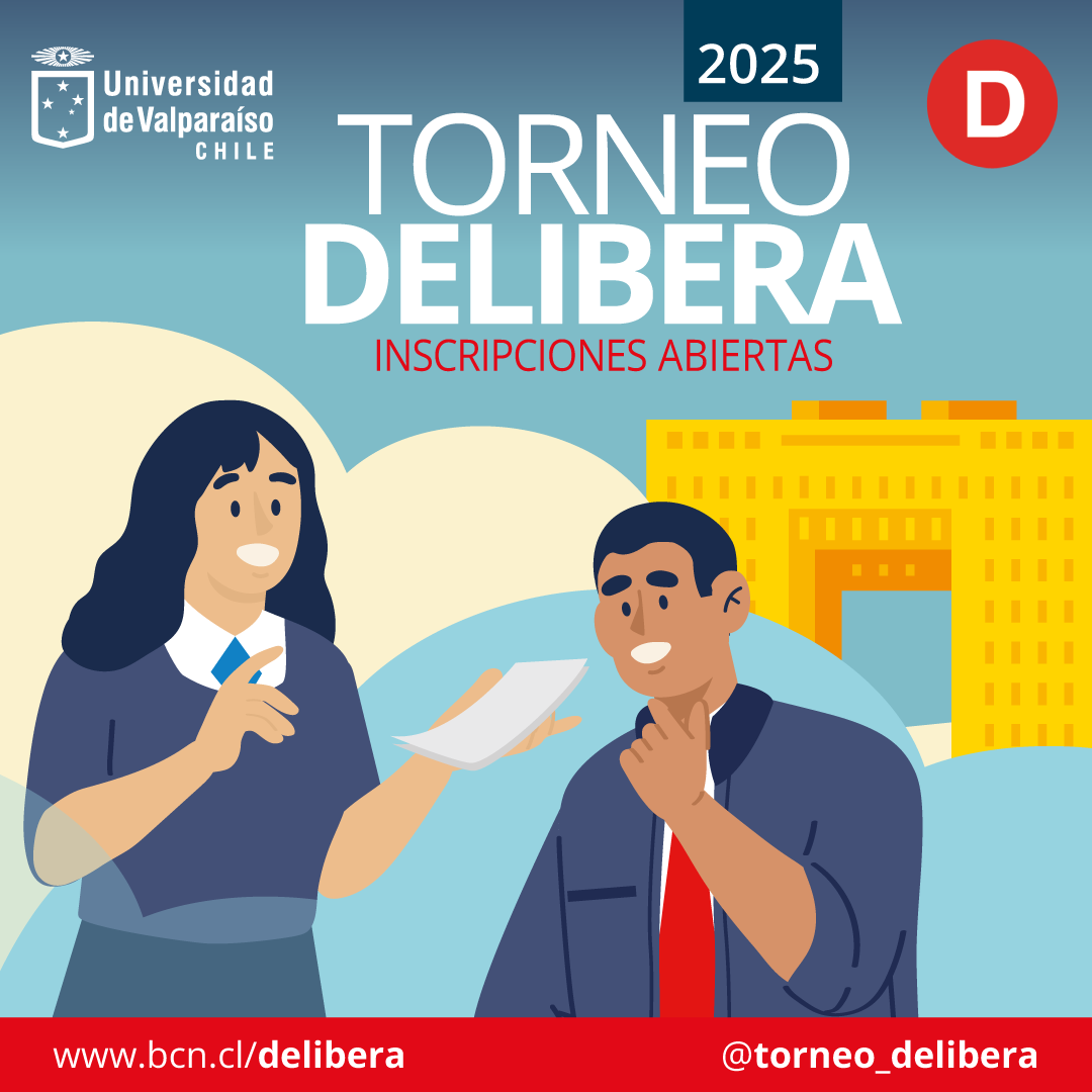 Hasta el martes 22 de abril se reciben las inscripciones para la decimocuarta versión del Torneo Delibera, competencia nacional interescolar de formación cívica convocada por la Biblioteca del Congreso Nacional (BCN), por mandato del Senado y la Cámara de Diputadas y Diputados. En la región de Valparaíso, el certamen es coordinado por la UV.