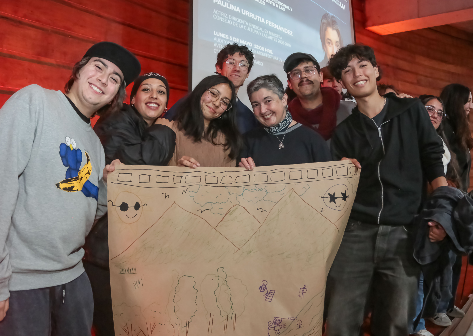 Uno de los momentos más destacados, fue cuando al terminar su presentación, invitó al escenario a grupos de estudiantes de las cinco escuelas a dibujar cómo ven y proyectan la Facultad.