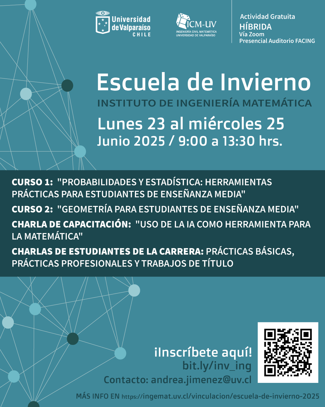 La actividad es organizada por el Instituto de Ingeniería Matemática UV, será gratuita y en modalidad híbrida, con clases en línea y presenciales en el auditorio de la Facultad de Ingeniería, General Cruz 222, Valparaíso.