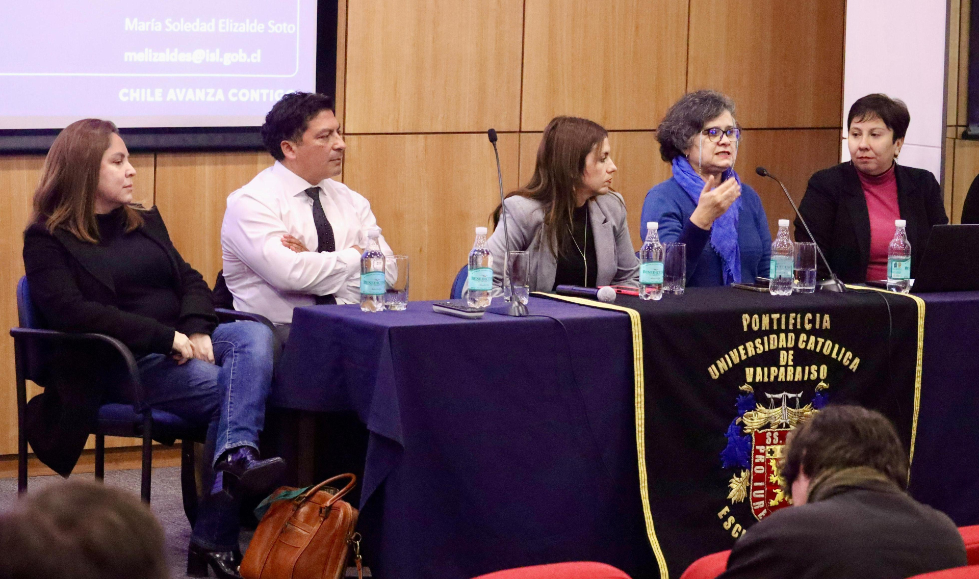 En la oportunidad se desarrollaron dos paneles, versando el primero de ellos sobre “La implementación de la Ley Karin desde una perspectiva institucional". En la instancia expusieron y dialogaron Rodrigo Cárdenas, abogado de la Oficina de Defensa Laboral de Valparaíso; Rachel Aránguiz, coordinadora de Relaciones Laborales de la Dirección del Trabajo de Valparaíso, y María Paz Bartolucci, jueza del Juzgado de Letras del Trabajo de Valparaíso. Moderó Tania Rojas, profesora de la UV.