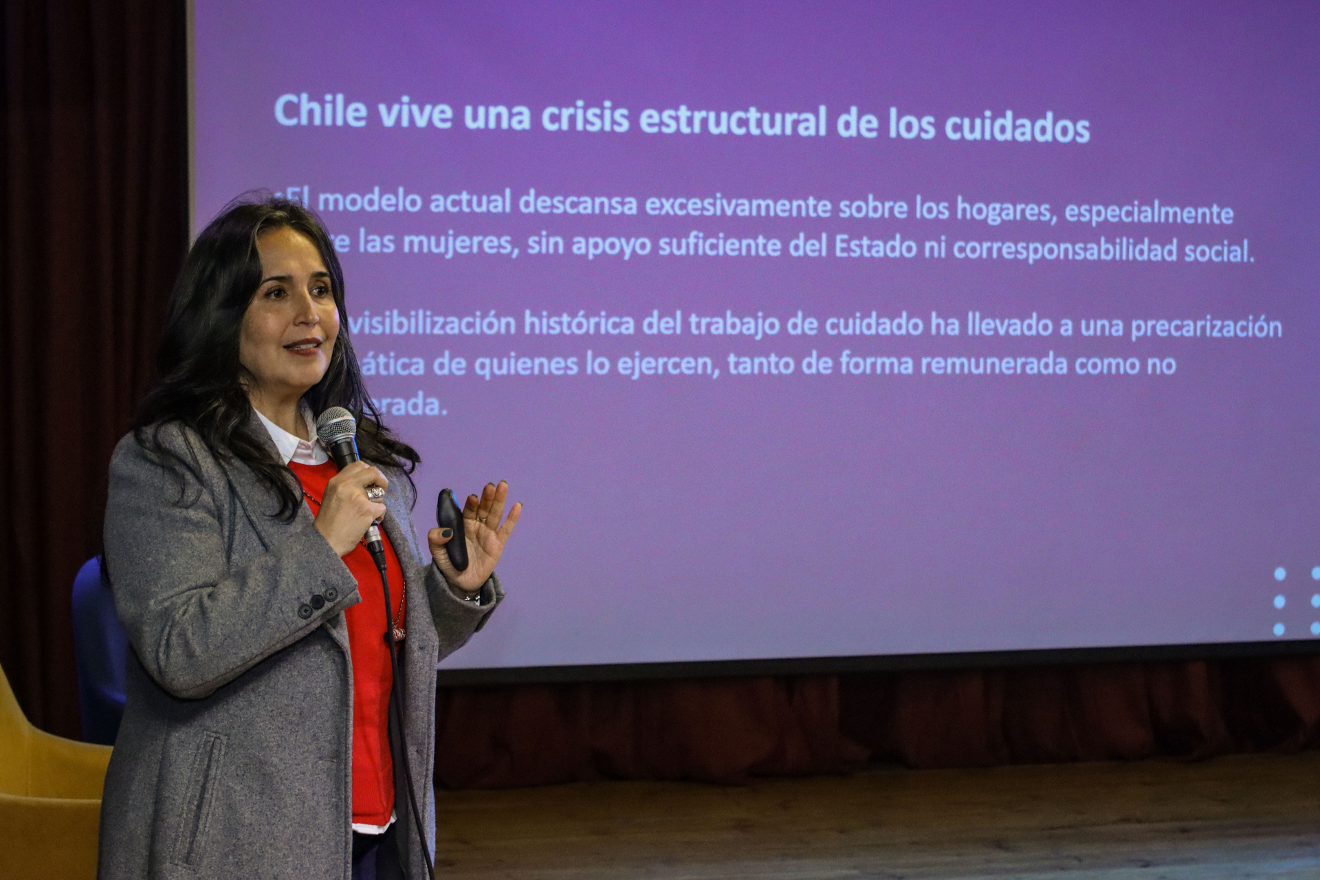 La seremi Claudia Espinoza, a su vez, desarrolló el tema “Política Pública Chile Cuida y Sistema de Cuidado. Respuesta estatal para garantizar derechos a cuidadoras y cuidados/as”. Abordó la visión integral de la política pública, en el marco de una crisis estructural de los cuidados.