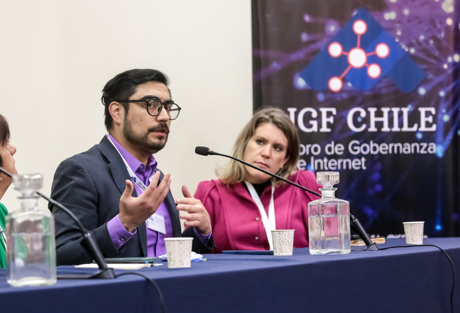 El primer panel versó sobre el tema “Gobernanza de internet”, y en él expusieron Catalina Frigeiro, directora de Incidencia y Políticas en Wikimedia Chile, y Juan Carlos Lara, director de la ONG Derechos Digitales. Moderaron la mesa y guiaron la conversación Ignacio Sánchez, académico del Instituto de Estudios Internacionales de la Universidad de Chile, y Patricia Peña, presidenta de Internet Society, Capítulo Chile, ambos integrantes de la directiva del IGF Chile.