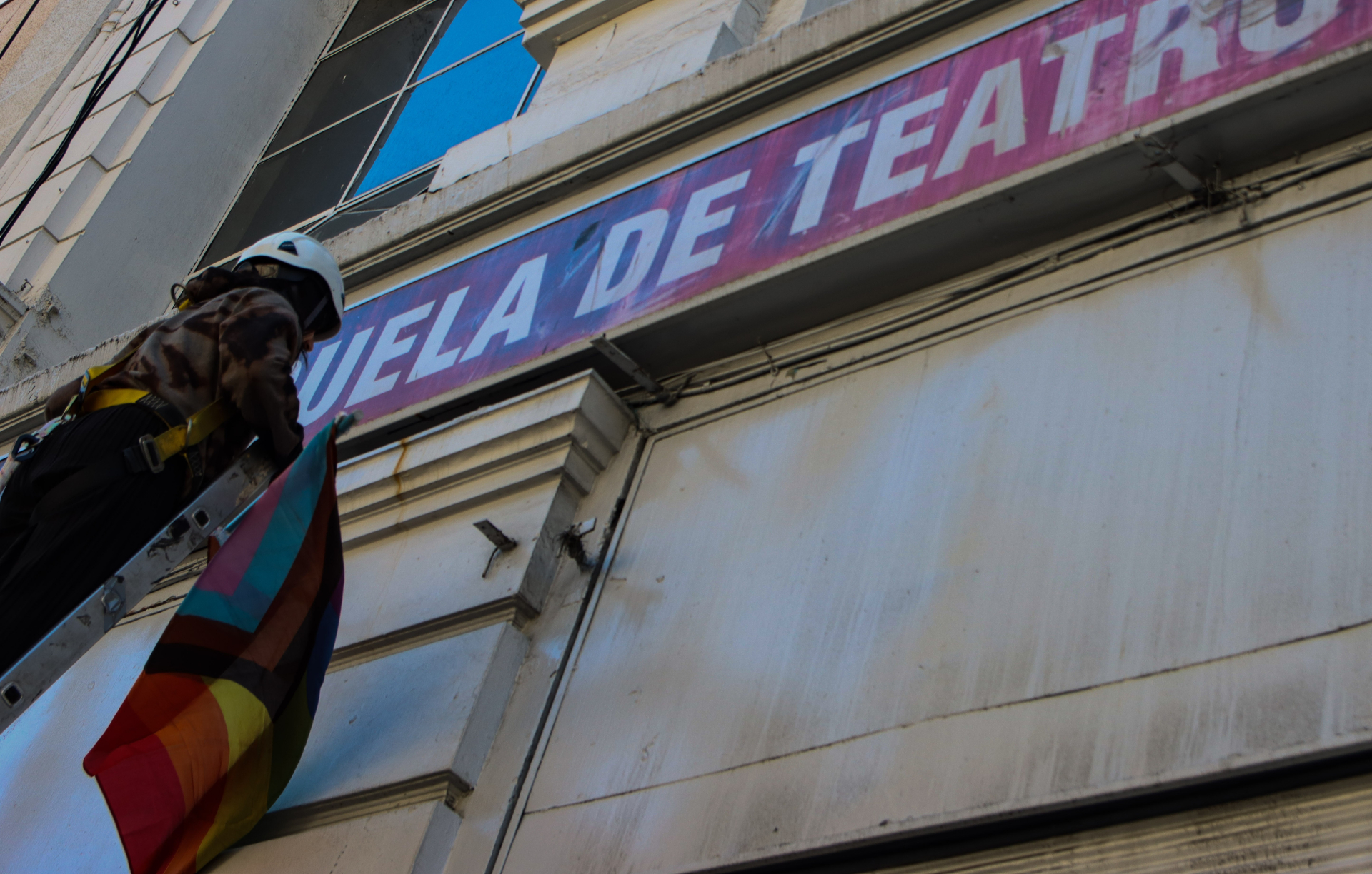 En el frontis de la Escuela y como es ya una tradición, estudiantes de Teatro de la Universidad de Valparaíso realizaron el tradicional izamiento de la bandera LGBTIQANB+ como parte de la conmemoración del Mes del Orgullo.