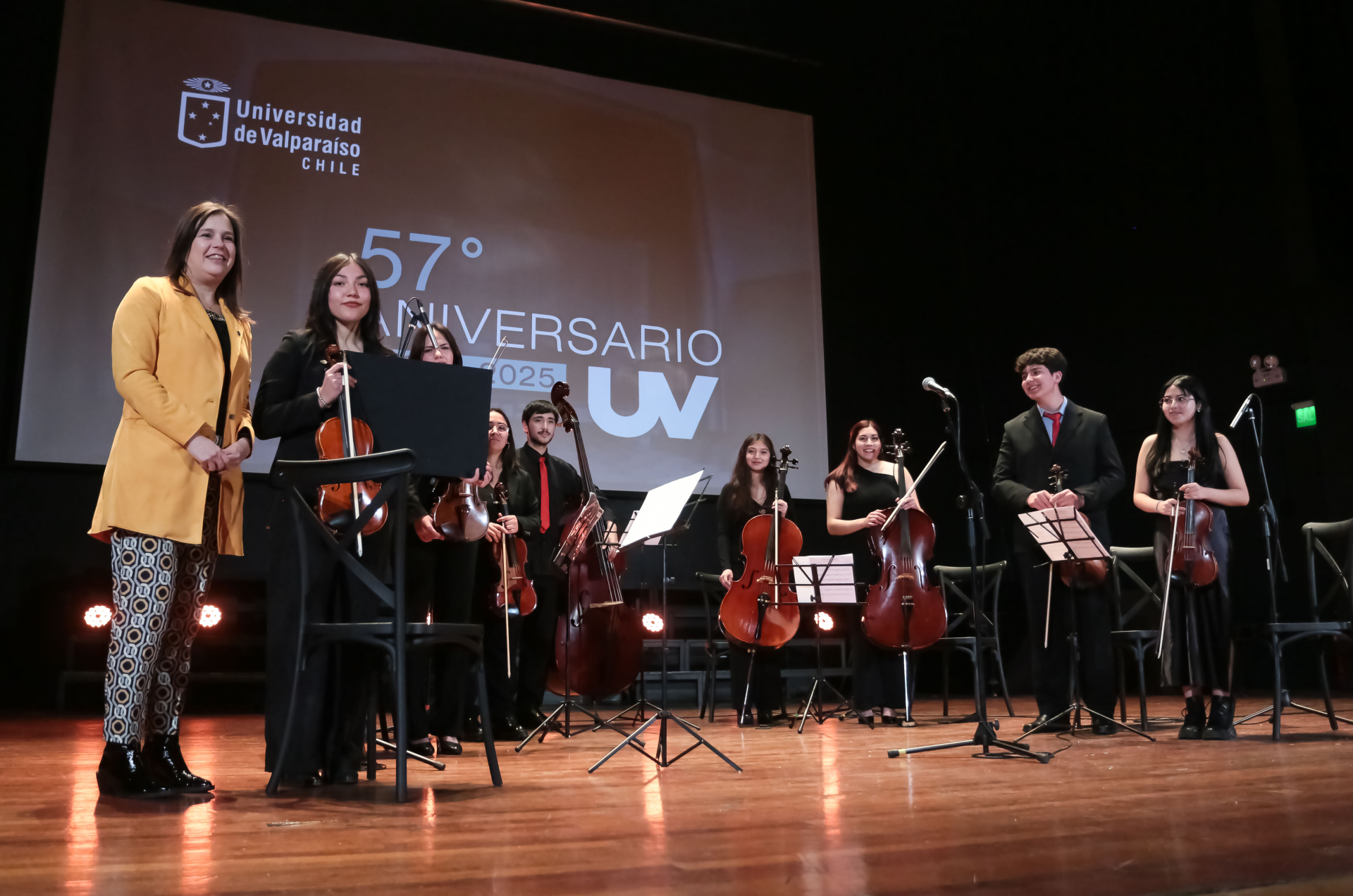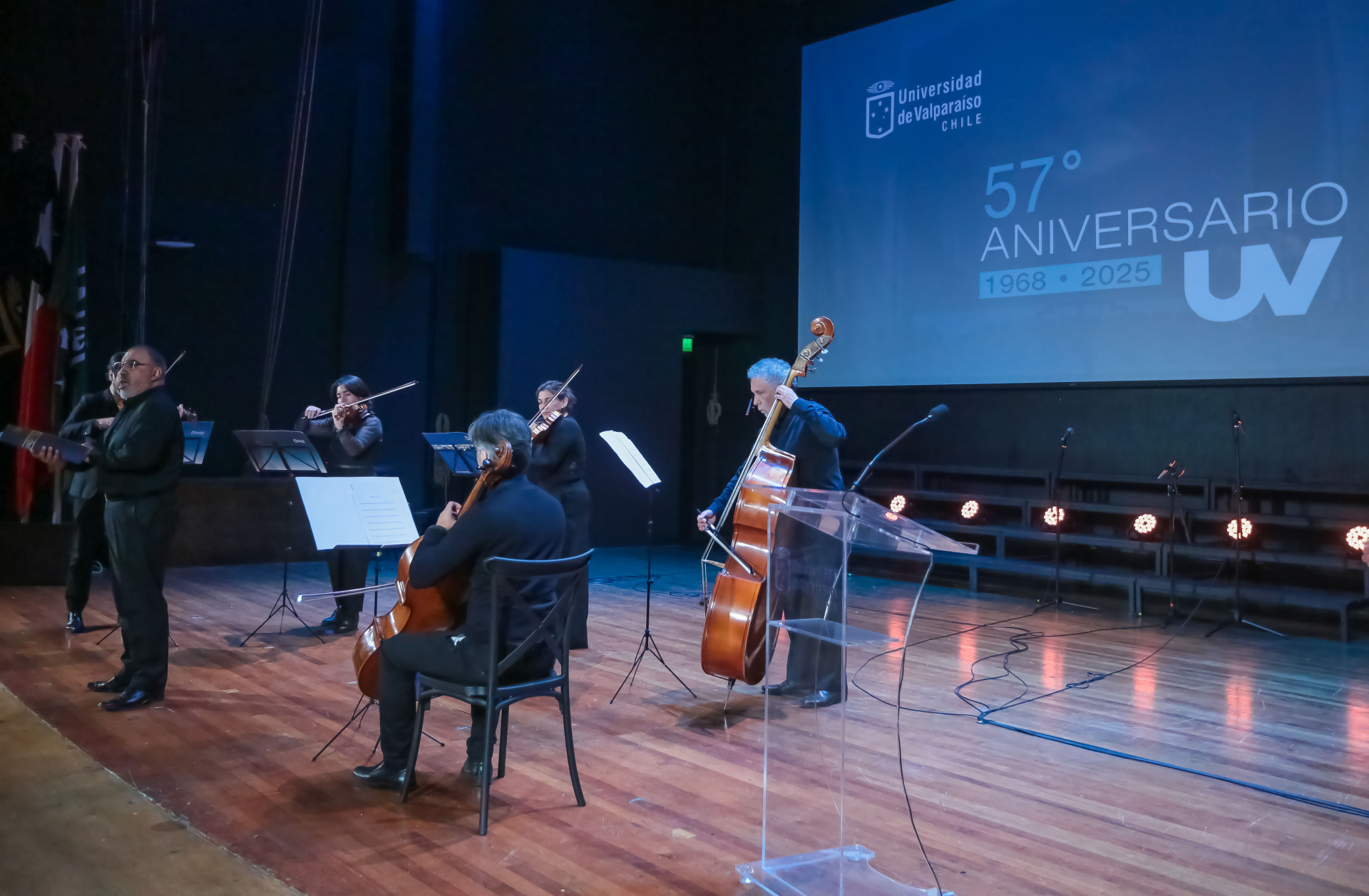 La ceremonia de aniversario 2025 culminó con la interpretación del himno institucional a cargo de la Agrupación Musical de Cámara de la Universidad de Valparaíso.