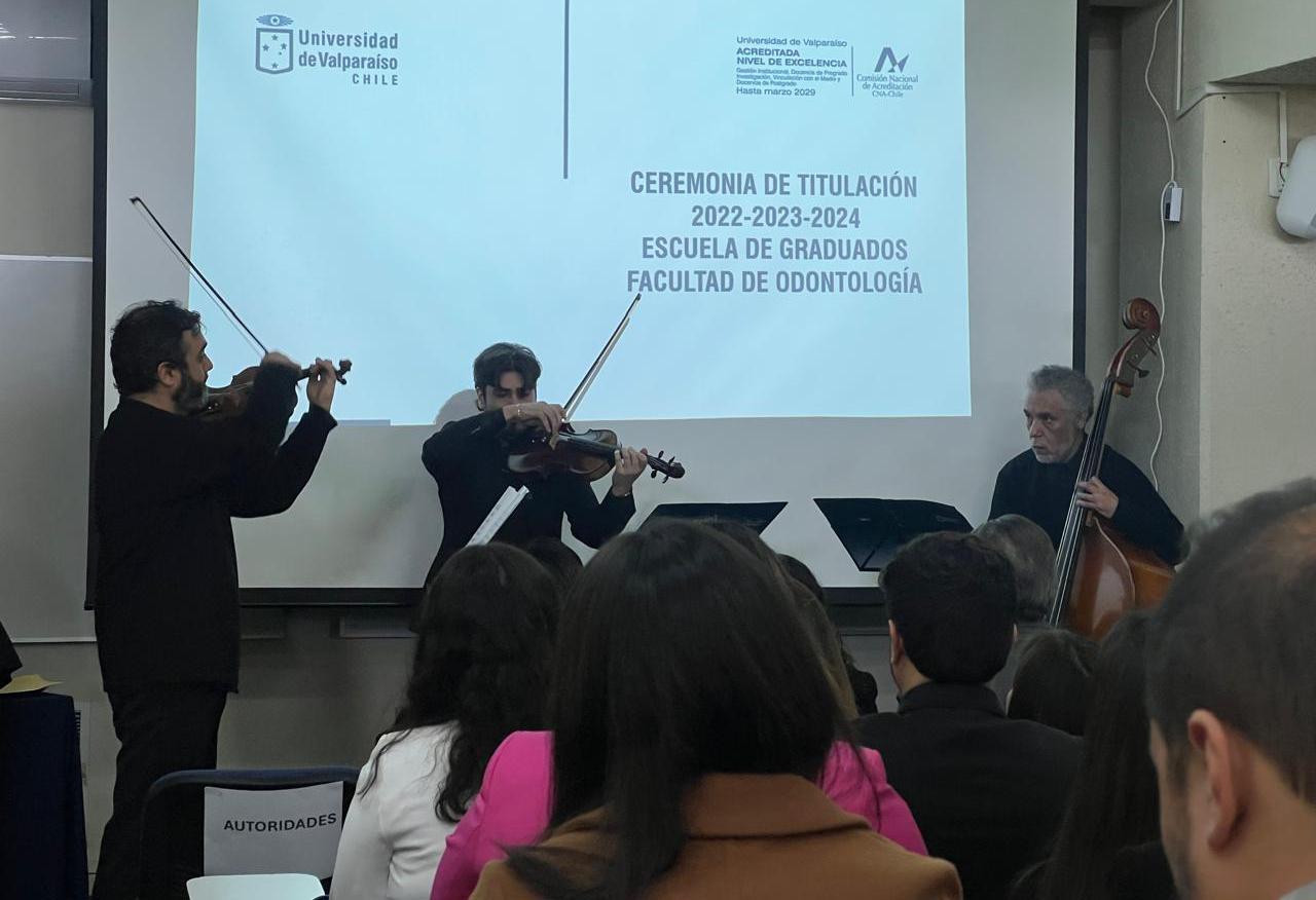 Por su parte, Consuelo Stemberga Castro, egresada de la Especialidad en Odontopediatría, destacó la dedicación que implicó su formación y la importancia simbólica del acto: “Estoy muy feliz de haber venido. Es importante cerrar los ciclos, especialmente después de tanto esfuerzo. Esta es una especialidad de dedicación exclusiva, y esta ceremonia fue como la cereza de la torta. Me gustó mucho la participación de la Agrupación de Cámara UV, fue un detalle que hizo aún más especial este momento”.
