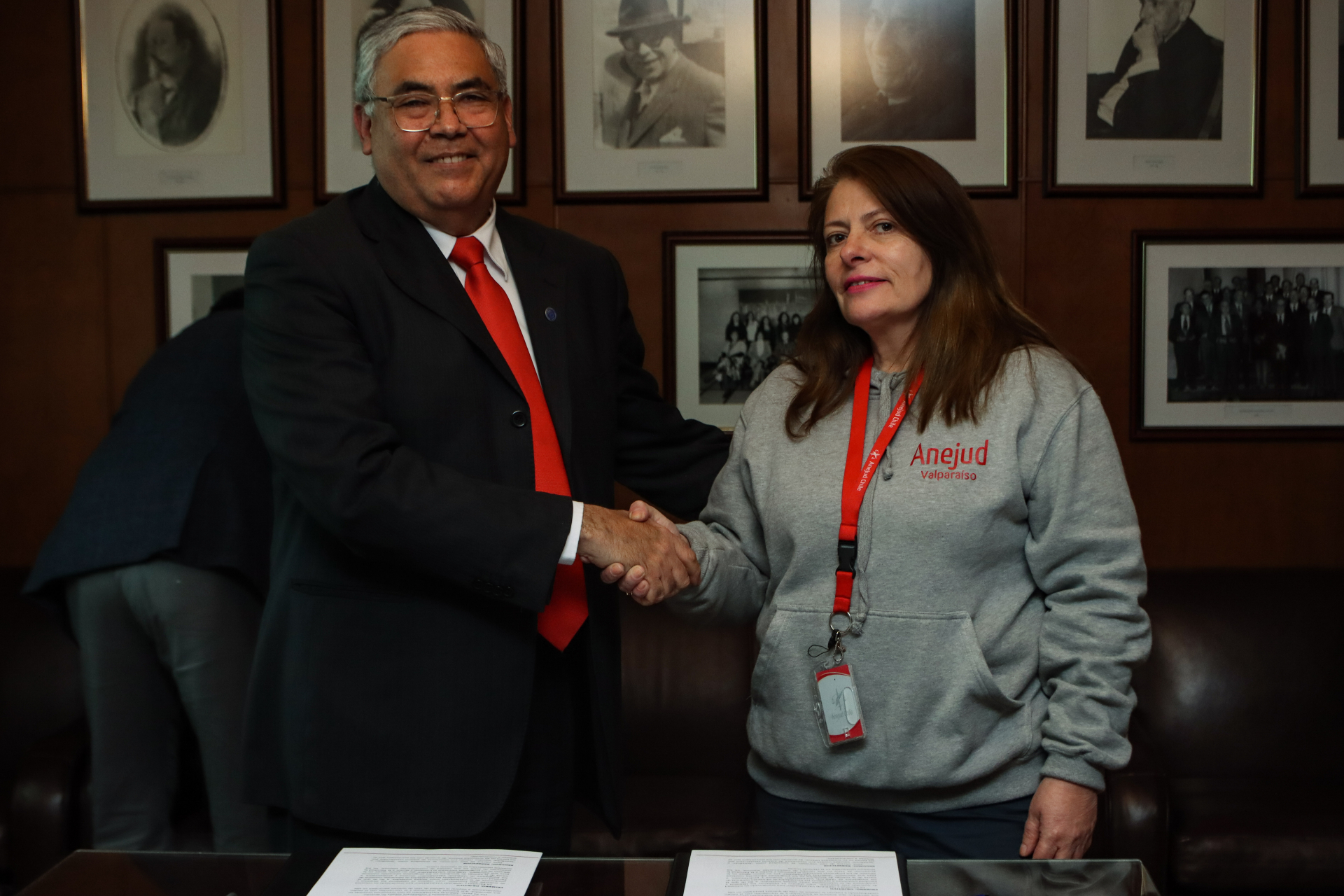 El documento fue firmado por el decano de la Facultad de Derecho, Ricardo Saavedra, y el presidente de Anejud Valparaíso, Amadeo Gnecco. Participaron de la jornada la vicedecana de la Facultad de Derecho, Patricia Reyes; la directora de la Escuela de Derecho, Inés Robles; la vicepresidenta de la Anejud Valparaíso, Fabiola Costa; el secretario de Anejud Valparaíso, Eduardo Bravo, y el abogado de la entidad, Hugo Contreras.