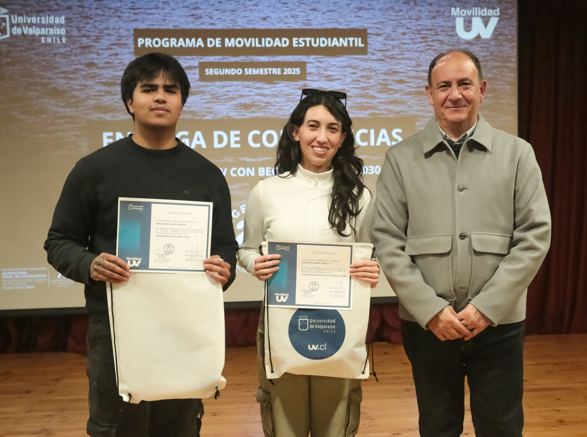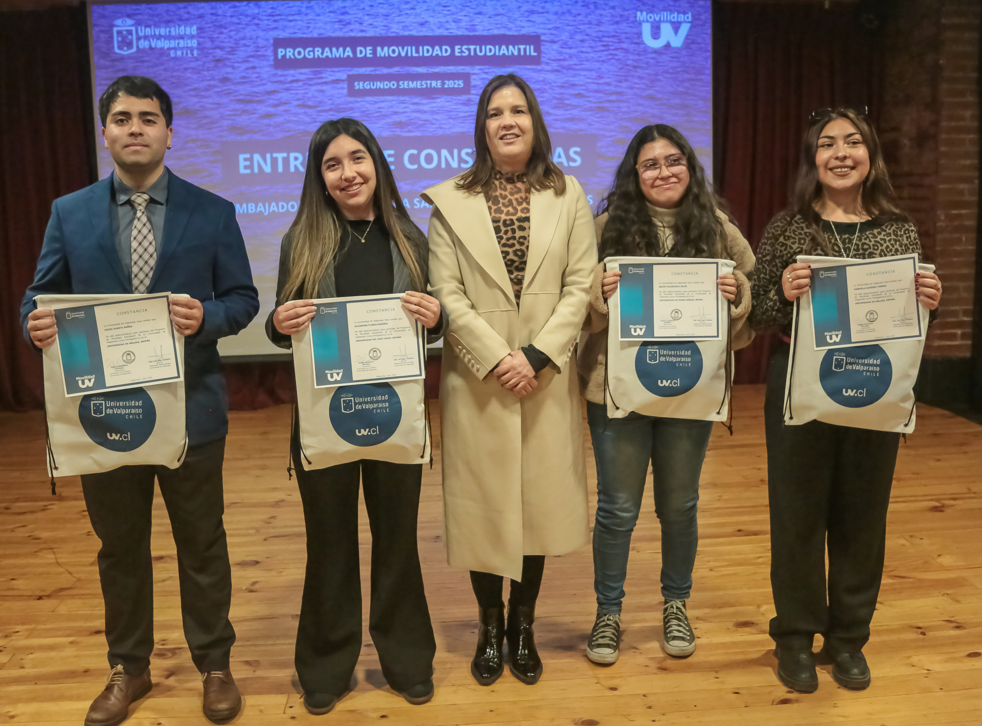 La ceremonia fue encabezada por Paulina Gundelach, vicerrectora de Vinculación con el Medio, junto a Carlos Becerra, vicerrector académico, además de autoridades académicas y representantes de las facultades y escuelas a las que pertenecen las y los estudiantes que viajarán.