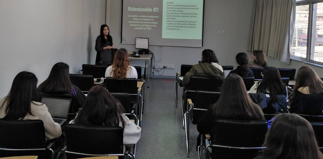 También se desarrolló la clase “Construyendo puentes, no murallas, entre las familias inmigrantes latinas y las escuelas”, la cual abordó los mitos y desafíos de la relación entre familia y escuela. Esta actividad fue dirigida a estudiantes de la carrera de Psicología, de las asignaturas de Práctica Intermedia y Profesional del área de Psicología Educacional, y de Práctica Profesional de Psicología Clínica Infanto Juvenil de la académica Silvia González.