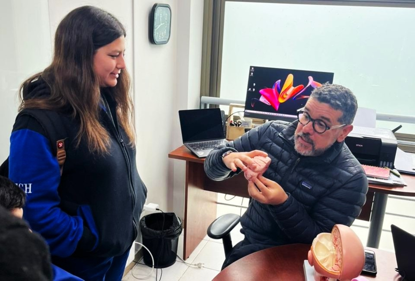 Además de la profesora y coordinadora Loreto Quiroz, los diecinueve estudiantes de la delegación del Colegio Héroes de Chile fueron acompañados en su visita a la Facultad de Medicina de la UV por los psicólogos Francisca Vera y Cristóbal Jerez y las educadoras diferenciales Justine Brantes y Javiera Toledo.