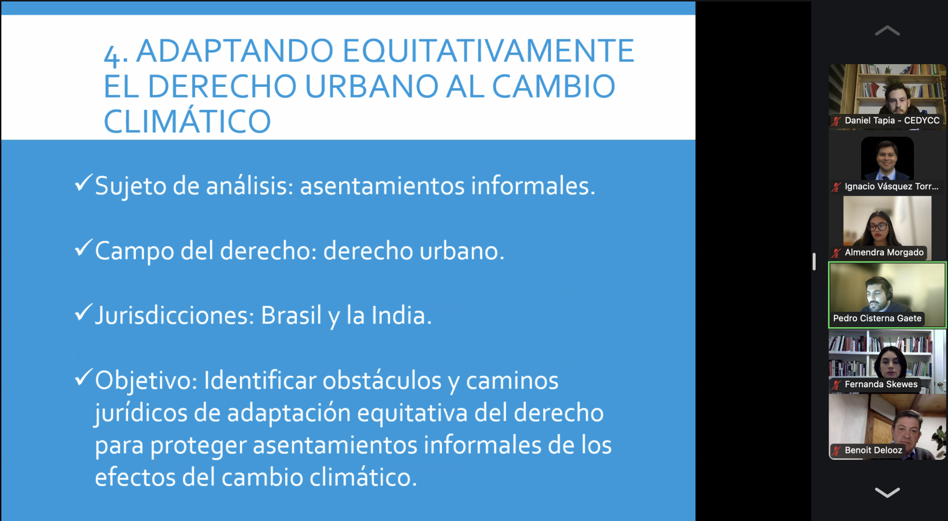 Finalmente, Pedro Cisterna se refirió a “Adaptación equitativa de la ley para proteger asentamientos informales de los efectos del cambio climático”, donde planteó una reflexión desde la justicia climática urbana, enfocándose en la protección de asentamientos informales. En este sentido, propuso que el derecho a la ciudad puede convertirse en una herramienta poderosa para enfrentar los efectos del cambio climático de manera equitativa, enfatizando tres pilares: marcos regulatorios inclusivos, una distribución espacial justa de recursos, y gobernanza urbana participativa, destacando experiencias relevantes en India y Brasil que pueden servir como referentes para avanzar en Chile.