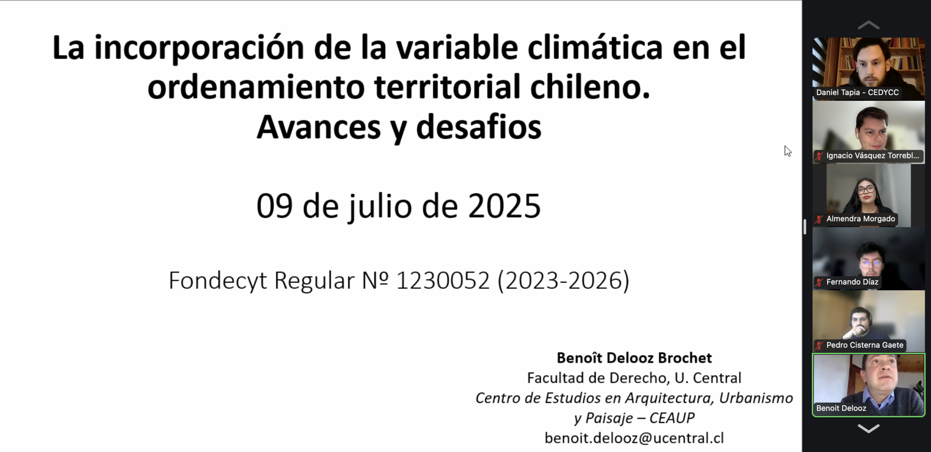 Primeramente, Benoît Delooz presentó la ponencia “La planificación climática del ordenamiento territorial. La experiencia chilena”, donde destacó la importancia de incluir variantes climáticas en la planificación urbana y regional. En esta línea, señaló que la falta de articulación entre escalas territoriales y políticas públicas dificulta una respuesta efectiva al cambio climático, y que se requiere avanzar hacia la incorporación de la sustentabilidad como criterio en la planificación territorial.