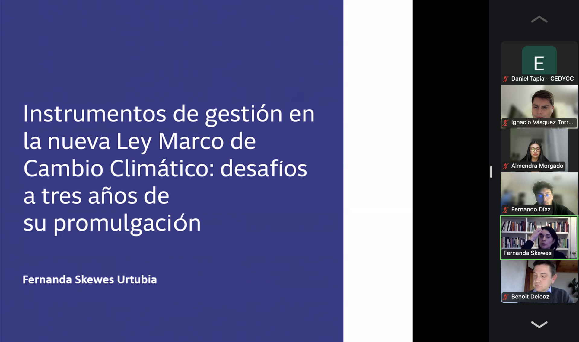 Por su parte, la presentación de Fernanda Skewes versó sobre “Instrumentos de gestión en la nueva Ley Marco de Cambio Climático: desafíos a tres años de su promulgación”, instancia en que analizó los mencionados instrumentos, explicando que si bien se observa un esfuerzo por institucionalizar la acción climática, también emergen tensiones, como la rigidez normativa, la dificultad en el diseño de estructuras de gobernanza adecuadas, y la necesidad de herramientas efectivas para medición, seguimiento y adaptación multiescalar.