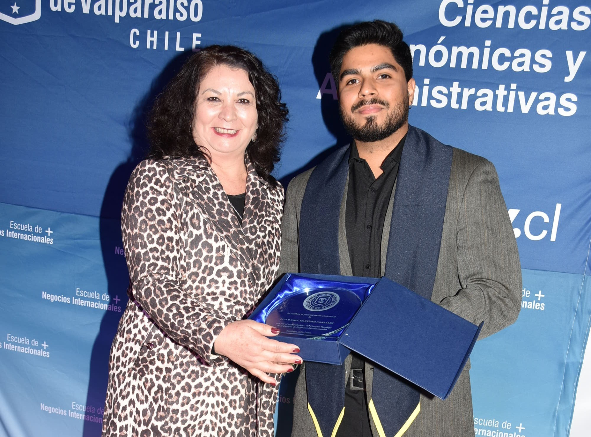 El profesional Luis Daniel Martínez González obtuvo reconocimientos por obtener los mejores promedios de la generación 2024, de manos de la vicedecana Marcela Fernández, y en las áreas de Inglés y Gestión. Entregaron estas distinciones, respectivamente, Jennifer Guzmán, integrante del Consejo Asesor Empresarial de la Escuela en representación de Ivo Sandoval, director regional de ProChile Valparaíso, y la profesora De Luca en nombre del Hospital Clínico IST.