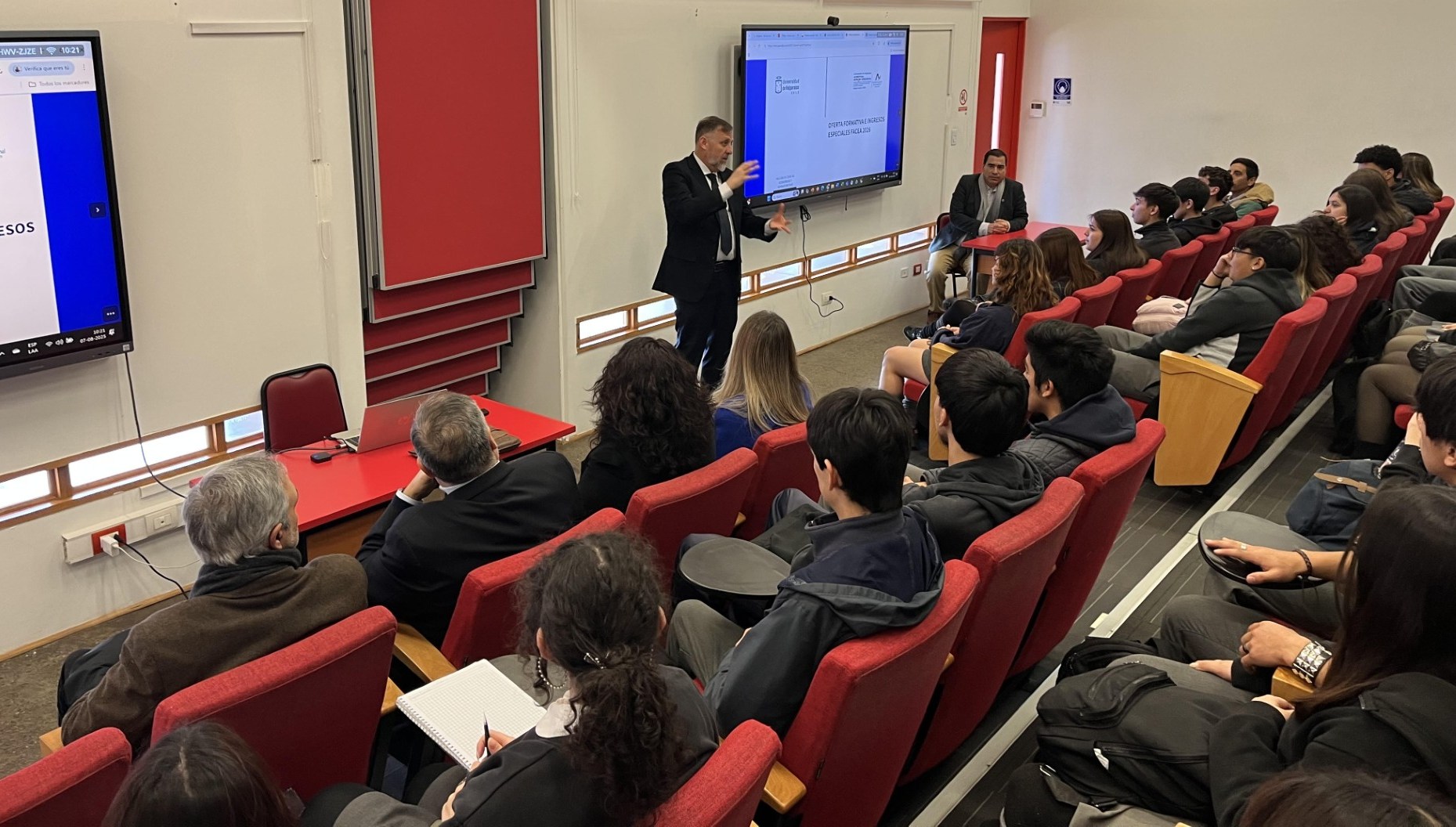 Los profesores Daniel Cáceres, coordinador de planificación de la FACEA, y la vicedecana Marcela Fernández, expusieron acerca de las oportunidades de innovación a propósito de temas como la tecnología y la Inteligencia Artificial y acerca de los ingresos especiales en las diferentes carreras, respectivamente. Las y los estudiantes tuvieron la oportunidad de conocer en detalle las características y oportunidades laborales de cada carrera y participaron activamente con preguntas.