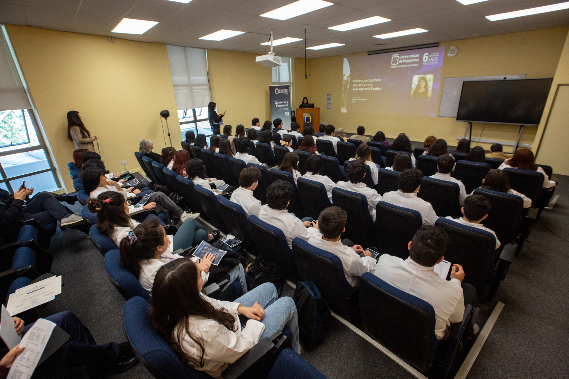 La ceremonia del Medio Farmacéutico, realizada en el Auditorio de la Facultad de Farmacia, marcó un hito en la formación de los estudiantes de tercer año, quienes desde septiembre comenzarán su práctica en farmacias comunitarias de la región de Valparaíso.