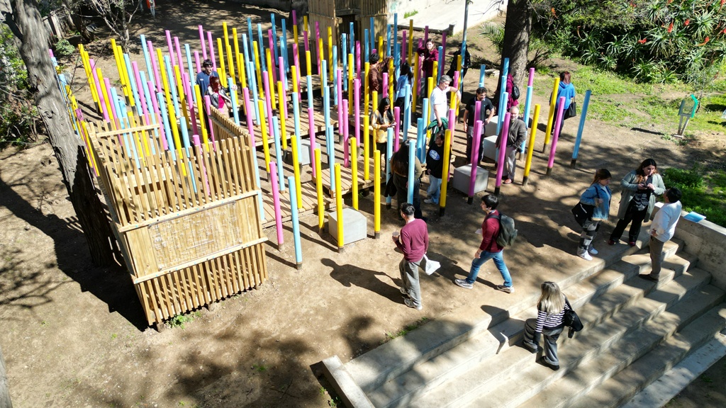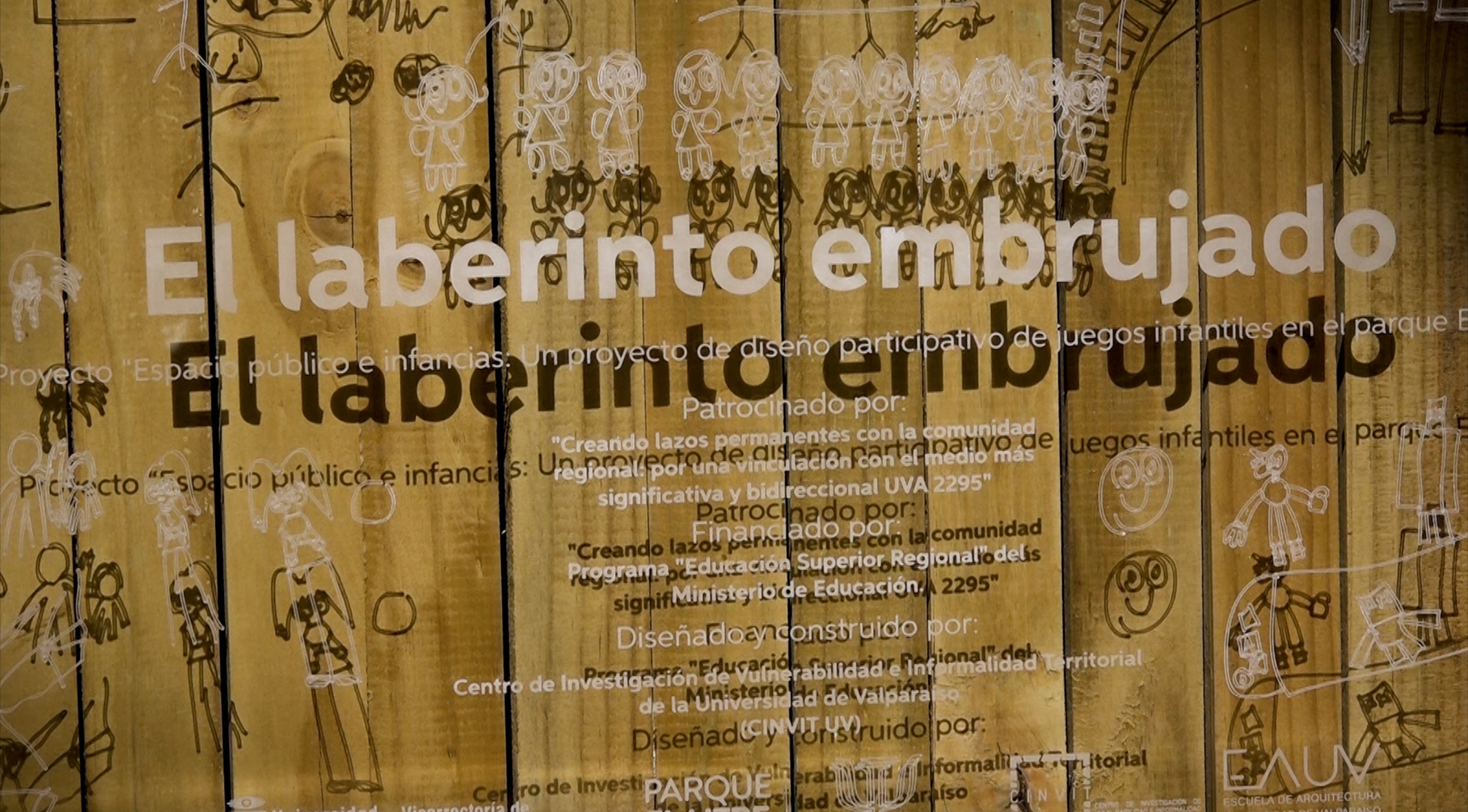 “El laberinto embrujado”, un conjunto de coloridos pilares de madera y altares de concreto que simulan un bosque atravesado por una sinuosa pasarela escalonada que une dos refugios, a través del cual niñas y niños pueden aventurarse seguros para explorar libremente cada uno de sus rincones y formas, es el singular e innovador juego infantil que la Universidad de Valparaíso y la comunidad local levantaron en el corazón del Parque El Litre de esta ciudad.
