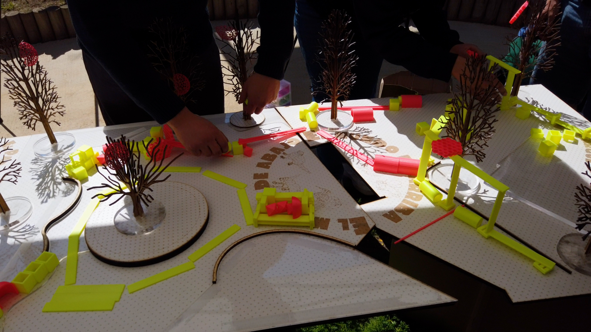 Tras las definiciones extraídas de los dibujos y comentarios se inició la segunda fase del proyecto, que incluyó la realización de un taller de codiseño en el que participó un grupo más reducido de niños y niñas, que trabajaron en la elaboración de maquetas que ellos mismos confeccionaron utilizando un conjunto de piezas móviles especialmente diseñadas para que pudieran armar el juego que querían crear.