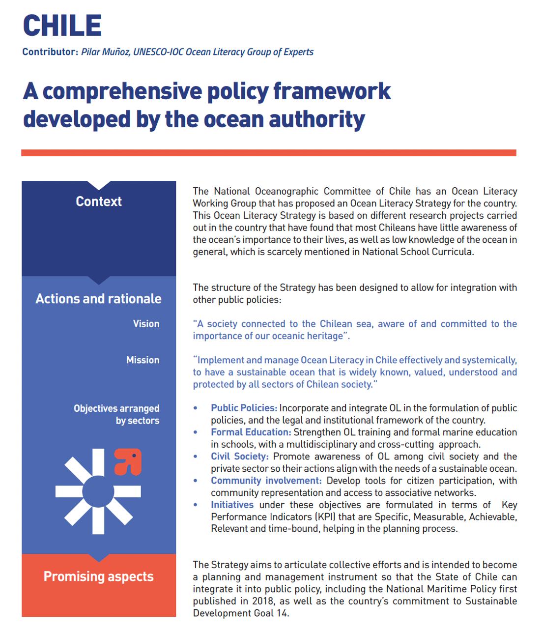 El documento, de 52 páginas, recopila experiencias internacionales y en su capítulo dedicado a Chile —página 32— releva el trabajo coordinado por el Comité Oceanográfico Nacional, que desde 2023 cuenta con un Grupo de Trabajo de Cultura Oceánica. Entre sus avances, destaca la propuesta de una Estrategia Nacional de Cultura Oceánica, orientada a integrar la educación sobre el mar en las políticas públicas, el sistema escolar y la participación ciudadana.