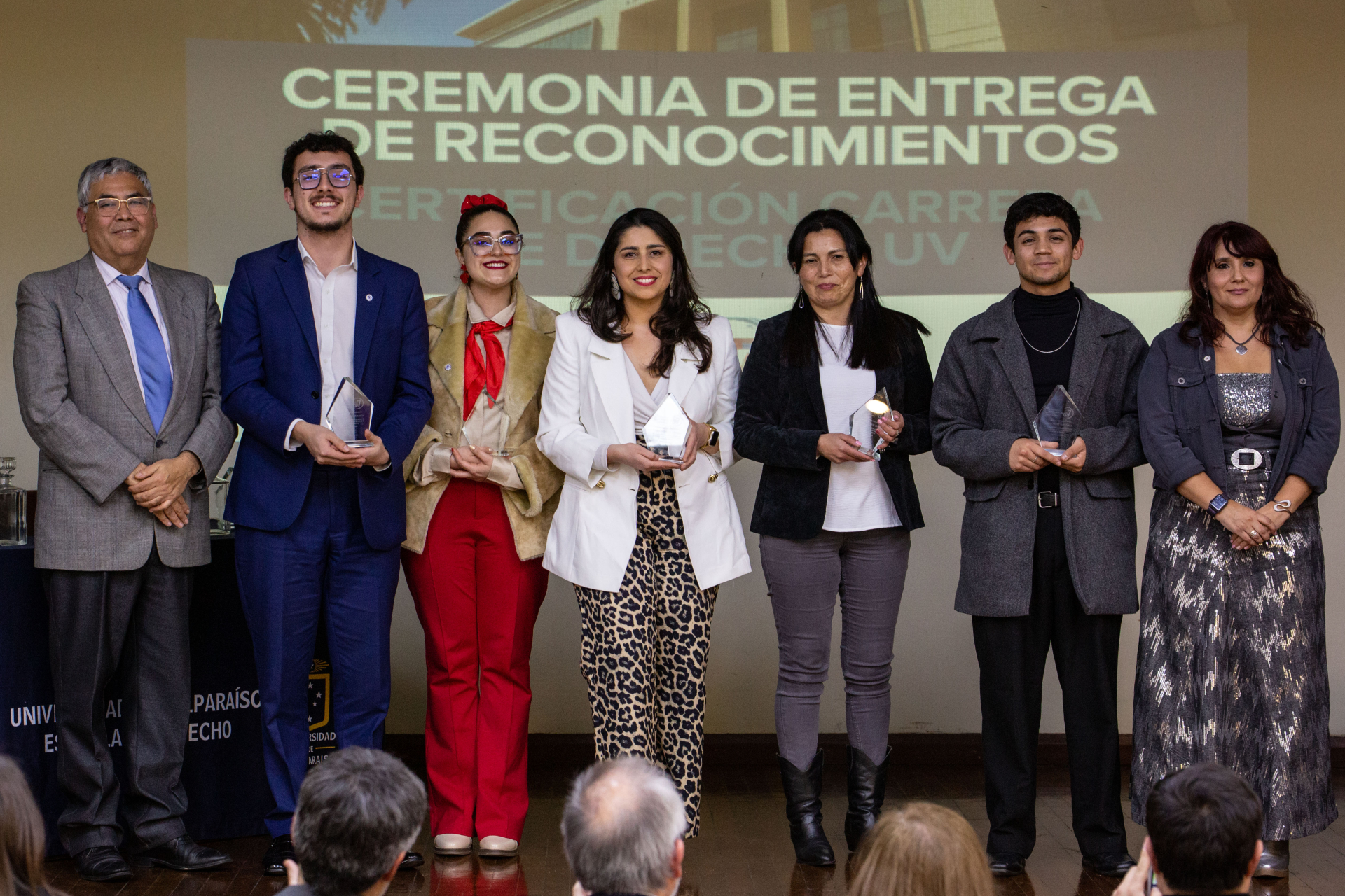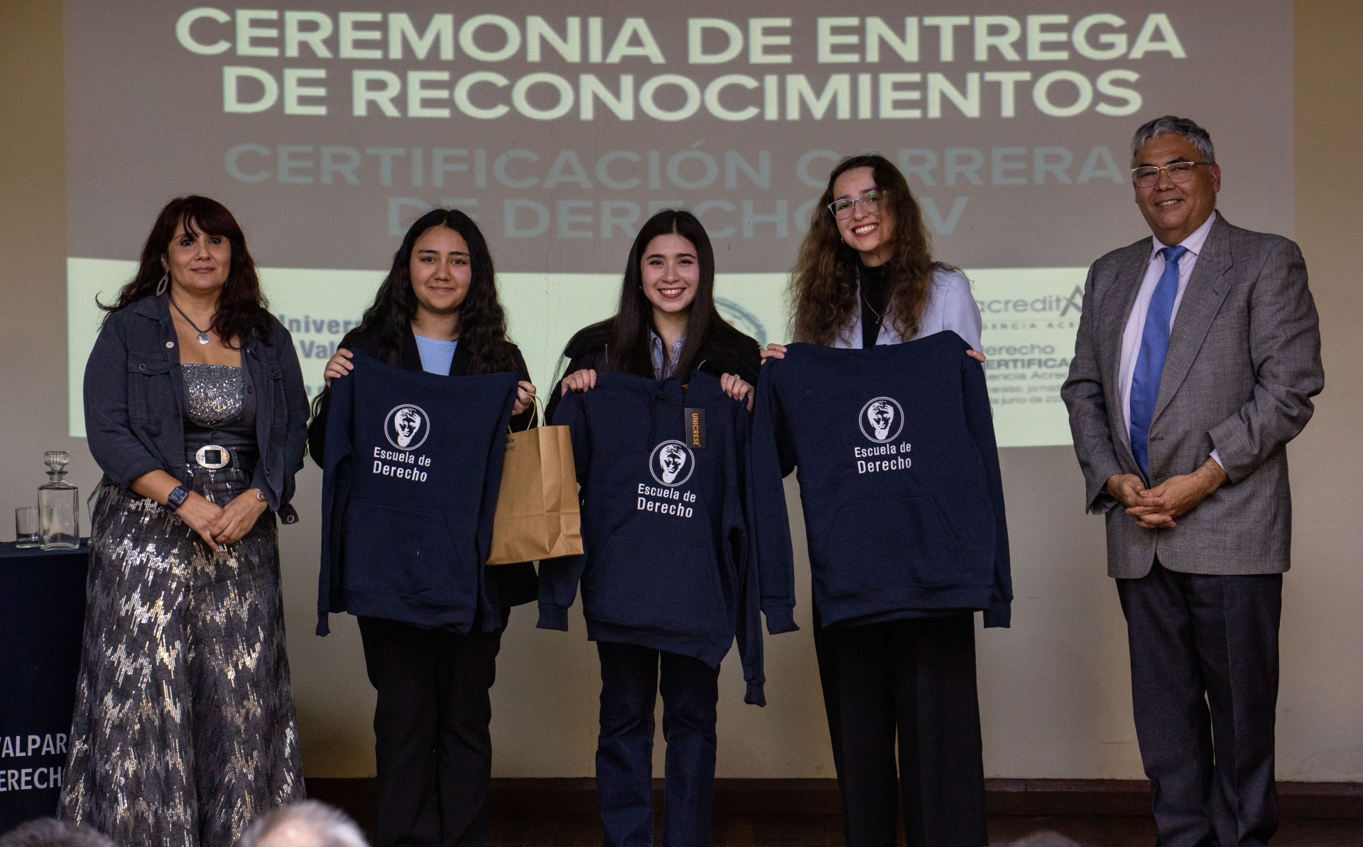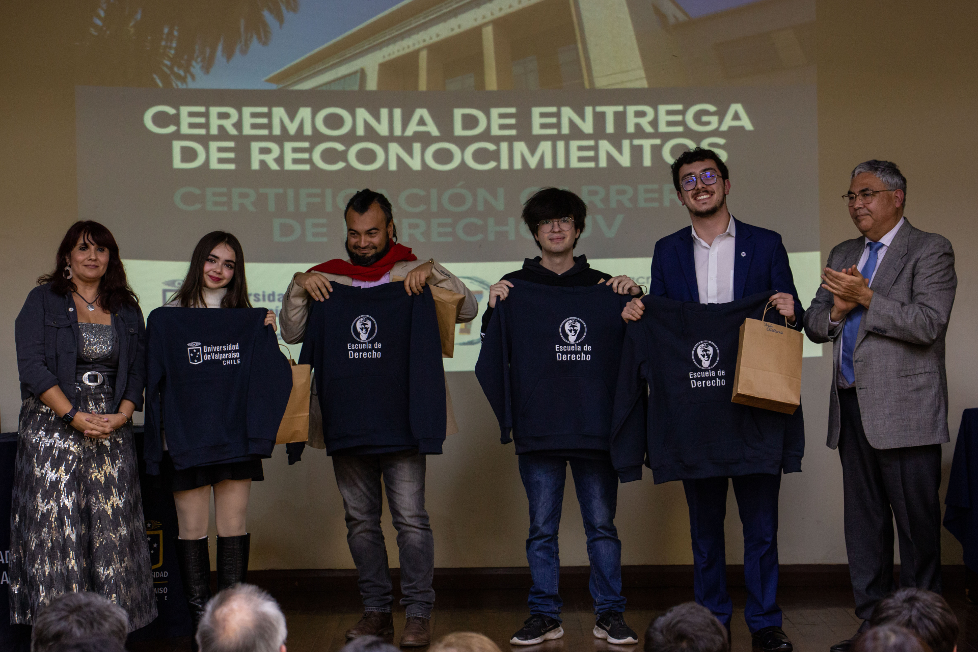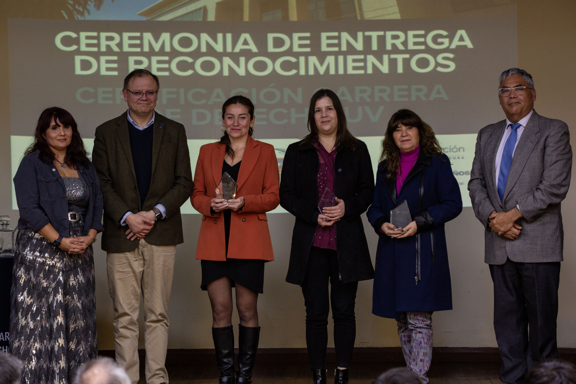 Asimismo, se hizo entrega de reconocimientos a integrantes de la comunidad de la Escuela de Derecho de la UV que apoyaron directamente las labores del Comité de Autoevaluación, los cuales fueron dirigidos a Nicole Contreras, Ibzán Orellana y Diego Pérez, estudiantes que participaron y colaboraron en las distintas instancias de difusión del proceso de Certificación; Camila Cortez, periodista de la Facultad de Derecho; Paola Salinas, encargada de Biblioteca de la Escuela de Derecho, y el actual Centro de Estudiantes de Derecho, presidido por Tamara Morales, en representación de los Centros de Estudiantes que se desempeñaron en el periodo 2018-2025.