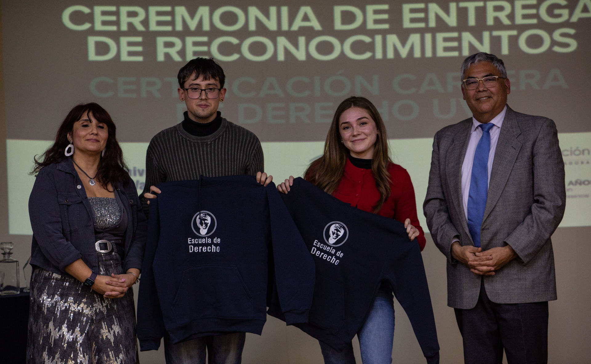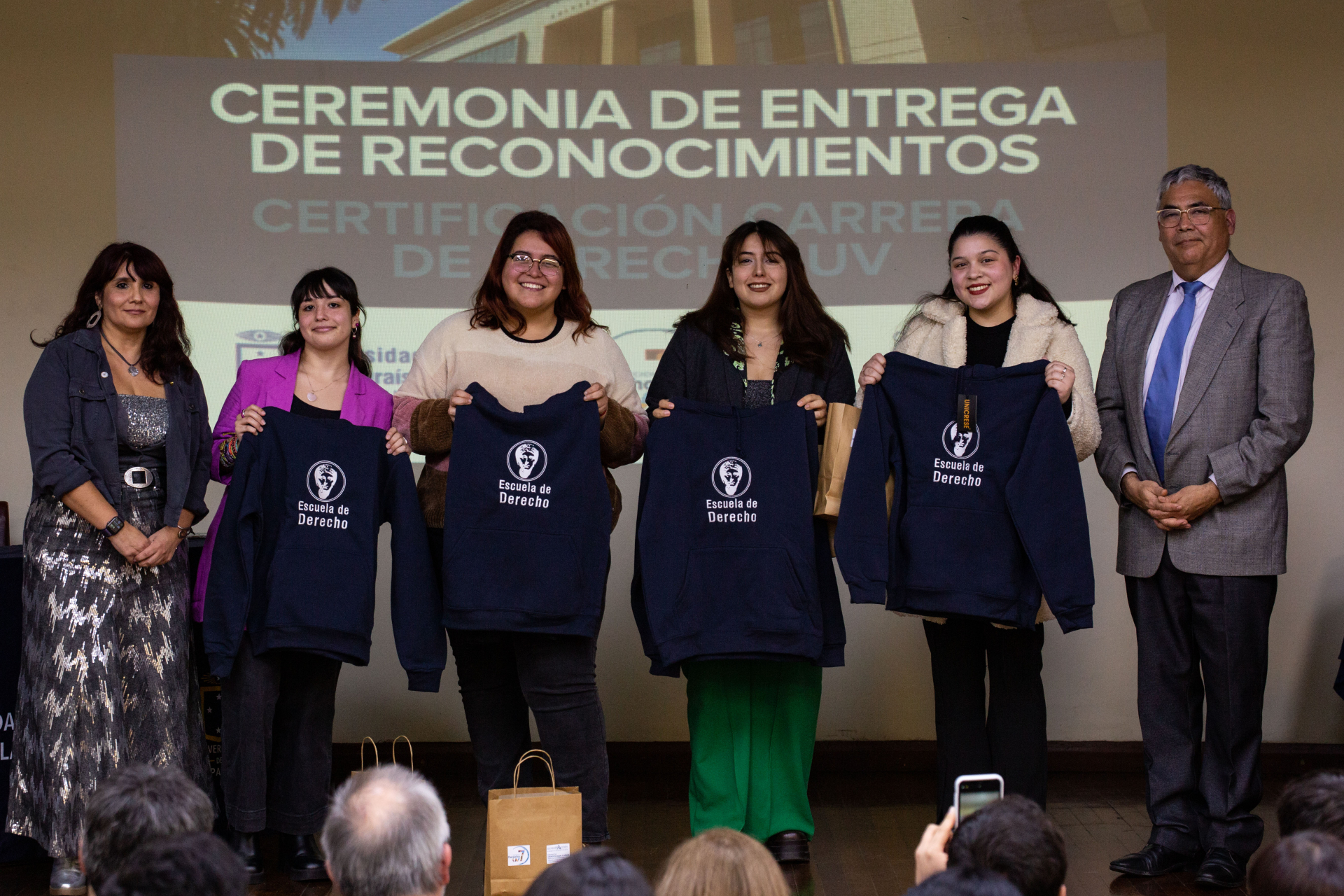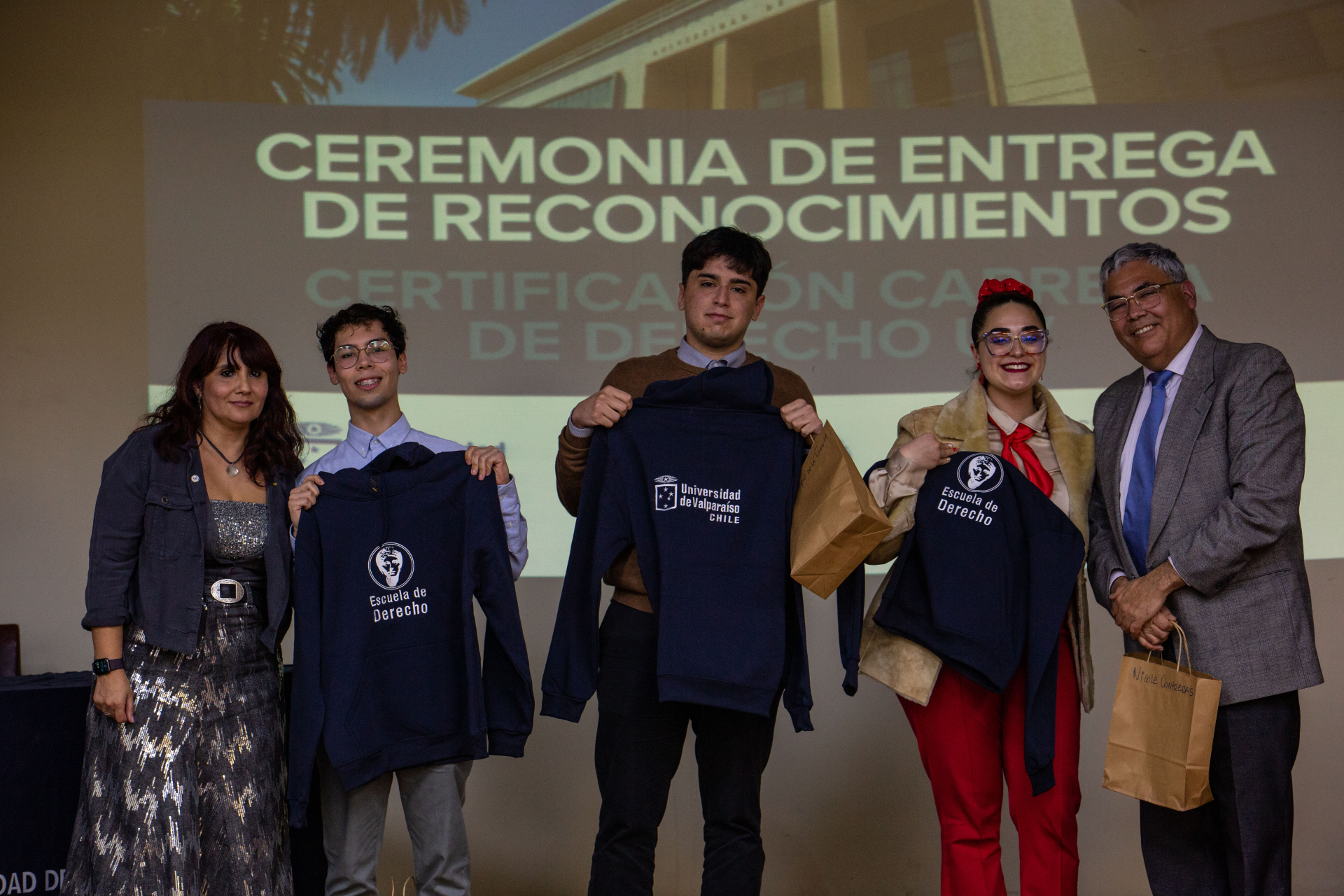 Asimismo, se hizo entrega de reconocimientos a integrantes de la comunidad de la Escuela de Derecho de la UV que apoyaron directamente las labores del Comité de Autoevaluación, los cuales fueron dirigidos a Nicole Contreras, Ibzán Orellana y Diego Pérez, estudiantes que participaron y colaboraron en las distintas instancias de difusión del proceso de Certificación; Camila Cortez, periodista de la Facultad de Derecho; Paola Salinas, encargada de Biblioteca de la Escuela de Derecho, y el actual Centro de Estudiantes de Derecho, presidido por Tamara Morales, en representación de los Centros de Estudiantes que se desempeñaron en el periodo 2018-2025.