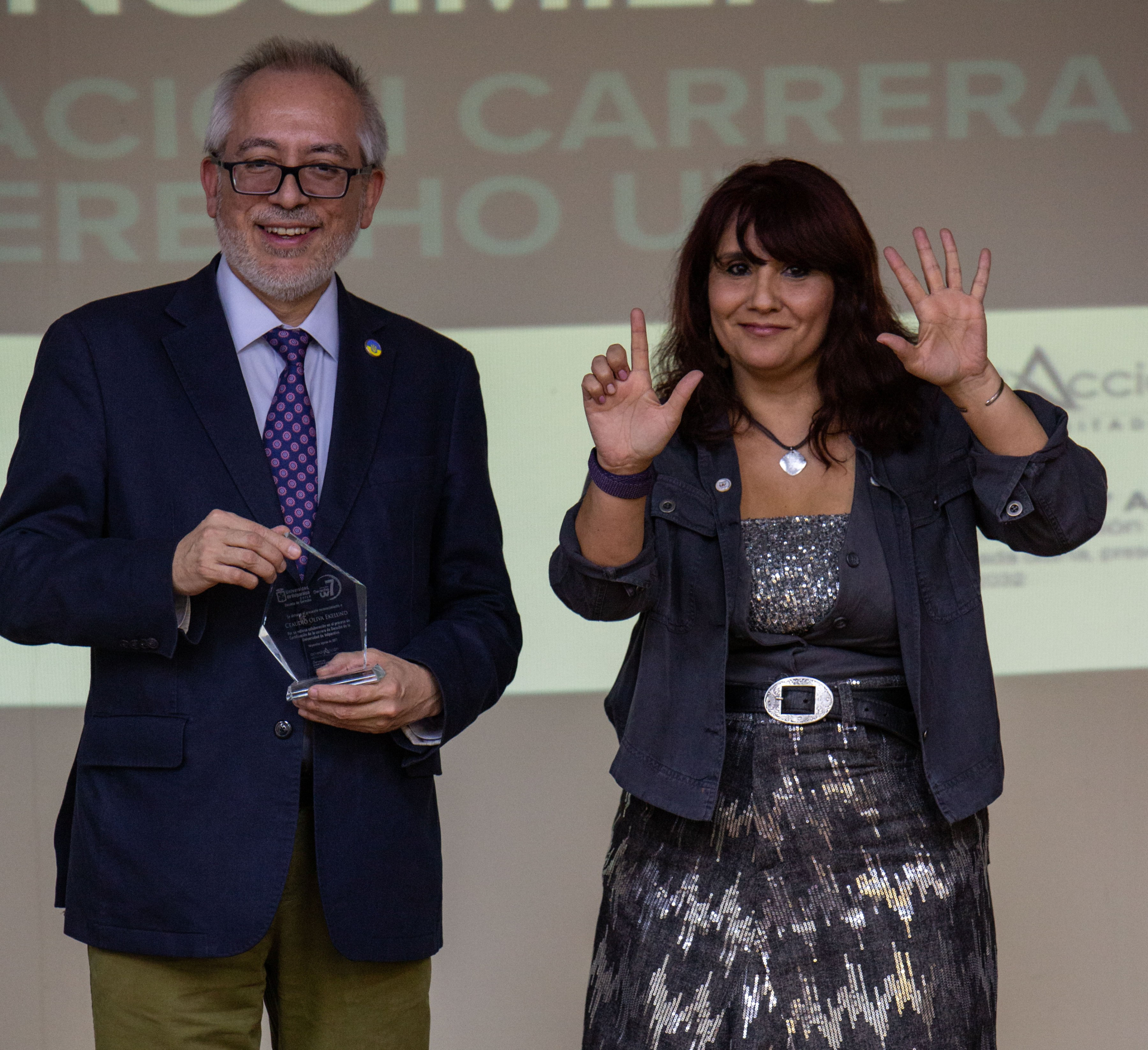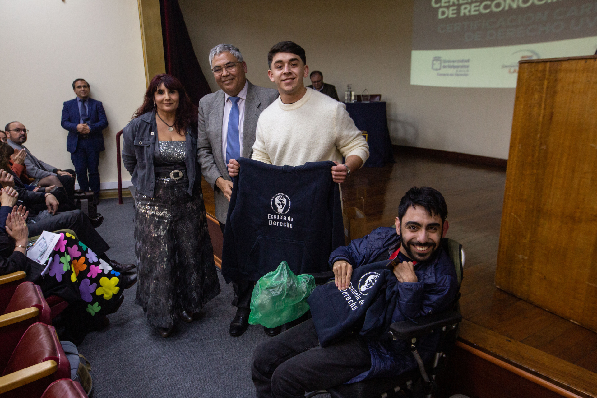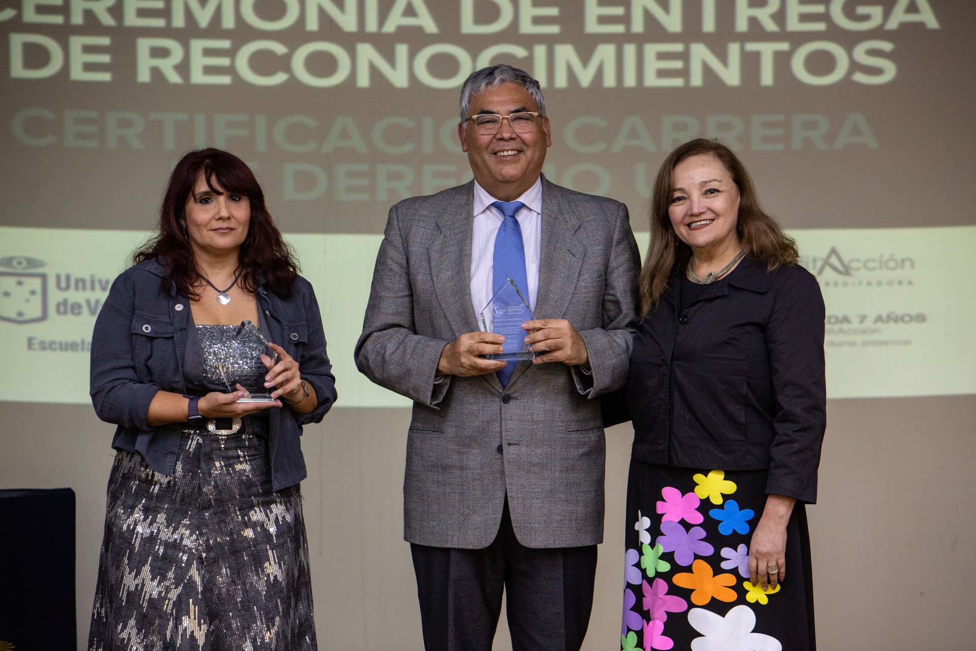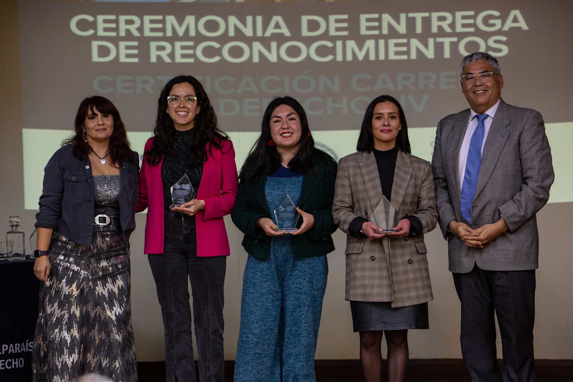 Asimismo, se hizo entrega de reconocimientos a integrantes de la comunidad de la Escuela de Derecho de la UV que apoyaron directamente las labores del Comité de Autoevaluación, los cuales fueron dirigidos a Nicole Contreras, Ibzán Orellana y Diego Pérez, estudiantes que participaron y colaboraron en las distintas instancias de difusión del proceso de Certificación; Camila Cortez, periodista de la Facultad de Derecho; Paola Salinas, encargada de Biblioteca de la Escuela de Derecho, y el actual Centro de Estudiantes de Derecho, presidido por Tamara Morales, en representación de los Centros de Estudiantes que se desempeñaron en el periodo 2018-2025.