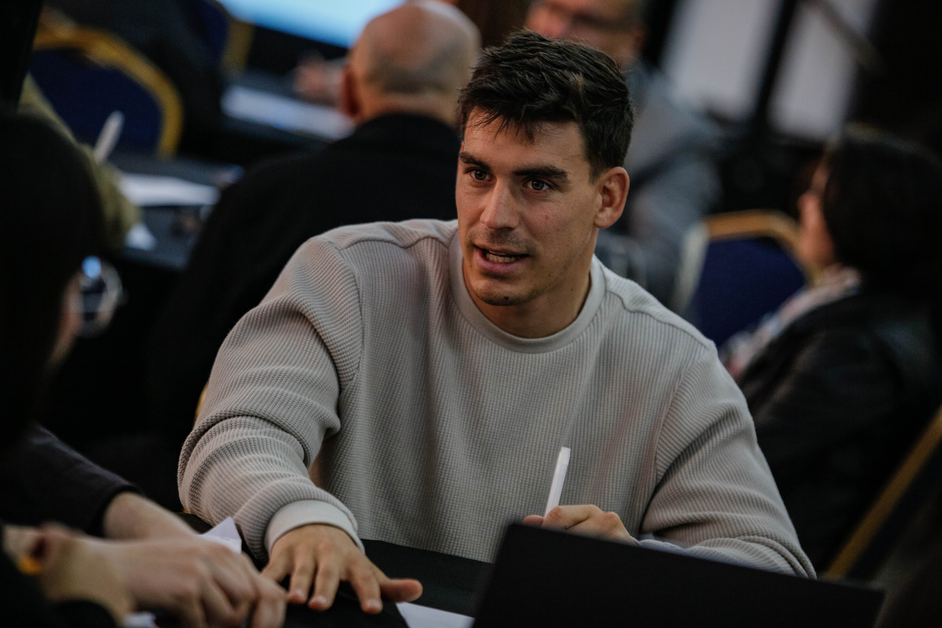 El segundo bloque de la actividad comprendió la conformación de mesas de trabajo integradas por equipos mixtos de investigadores y estudiantes, con el propósito de avanzar en soluciones conjuntas, contando con un monitor que dirigió la dinámica y metodología de trabajo. Al finalizar, tuvieron un máximo de tres minutos para presentar sus principales conclusiones.