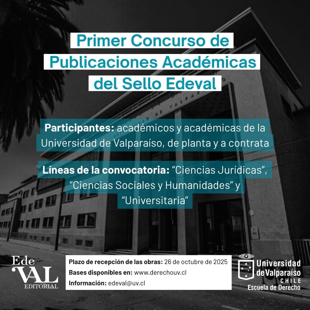 Con el objetivo de contribuir a la investigación en diversas disciplinas, editorial Edeval de la Facultad de Derecho de la Universidad de Valparaíso invita a profesores y profesoras de la UV a postular al Primer Concurso de Publicaciones Académicas del sello, en el marco de la ejecución del Fondo Proyecto ADAIN, UVA 2493.