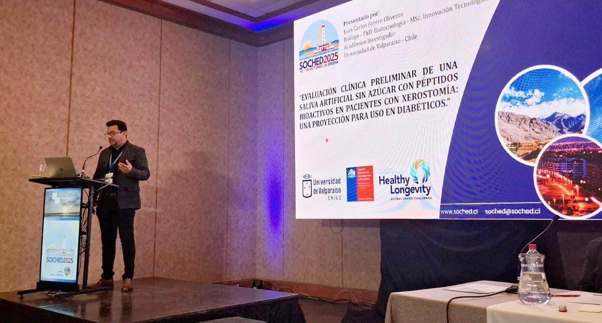 La Universidad de Valparaíso avanza en el desarrollo de una saliva artificial con propiedades antimicrobianas y regenerativas destinada a mejorar la salud bucal de personas con diabetes y xerostomía (sensación de boca seca causada por una producción insuficiente de saliva). La iniciativa es liderada por el académico Juan Carlos Forero, director del Laboratorio de Bioingeniería Oral y de Tejidos de la Facultad de Odontología de la UV, y fue recientemente reconocida con el primer lugar en el área de diabetes durante el XXXVI Congreso de la Sociedad Chilena de Endocrinología y Diabetes (Soched).