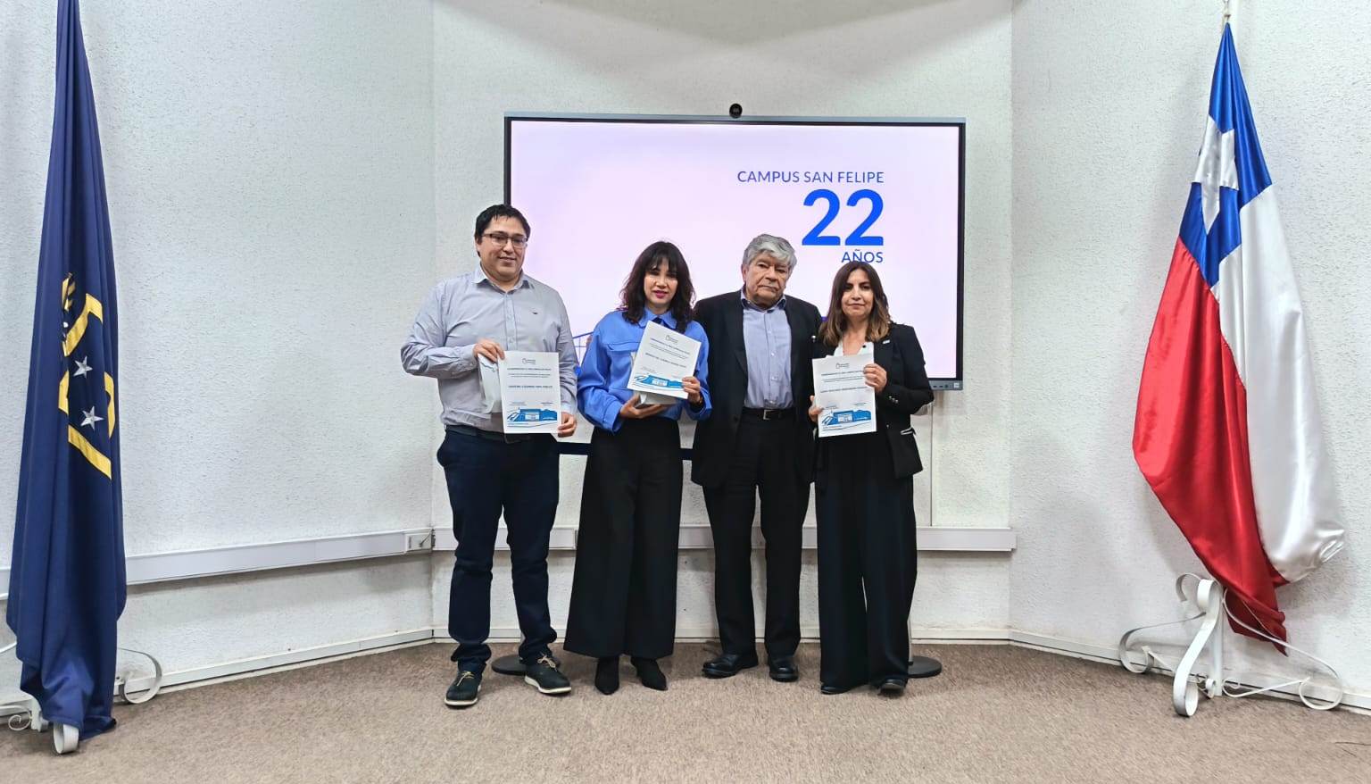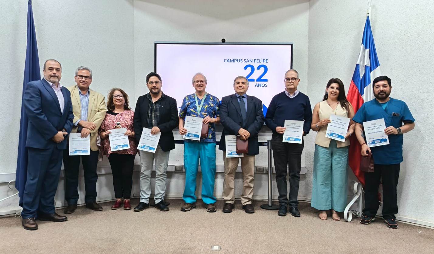 Encabezaron la ceremonia el vicerrector de Gestión Institucional, Christian Corvalán, junto al decano de la Facultad de Medicina, Antonio Orellana, y el director del Campus San Felipe, Francisco Pantoja, quienes además fueron los encargados de entregar los reconocimientos a las personas homenajeadas por sus años de servicio.