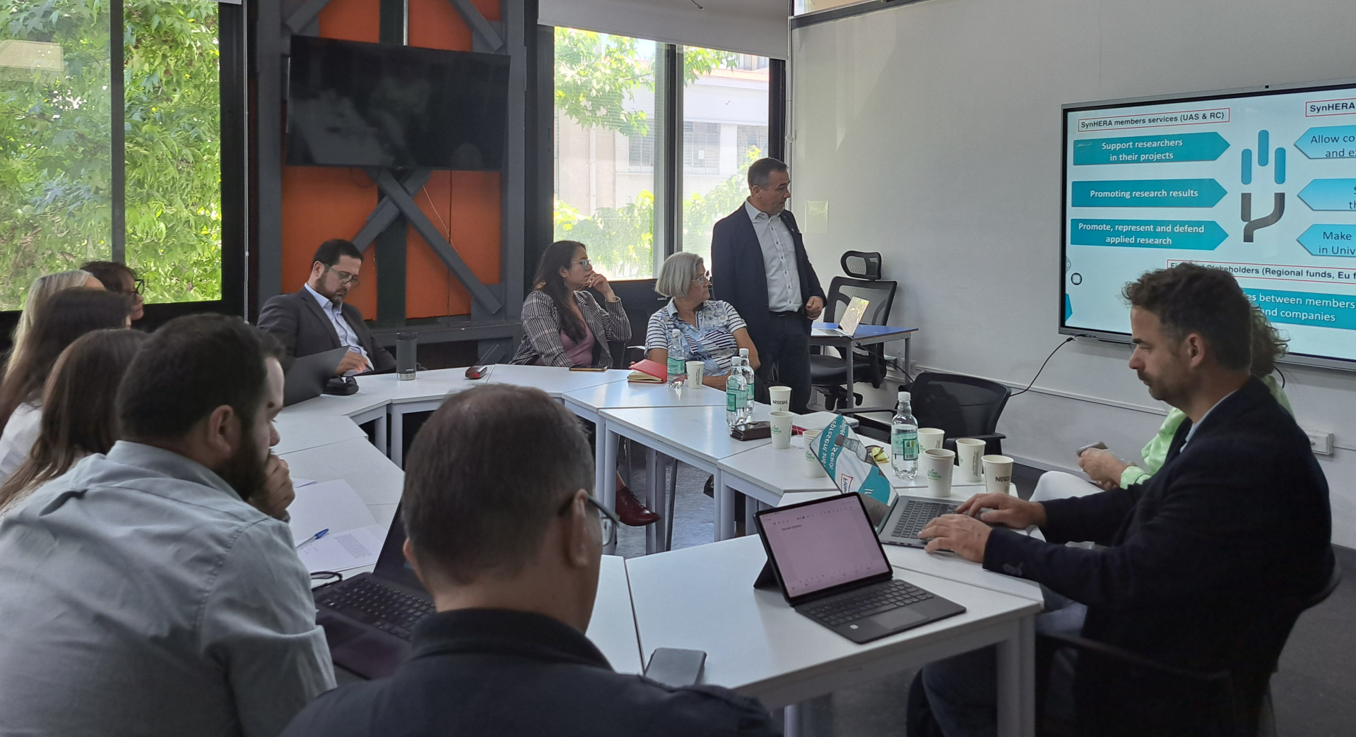 La cita se desarrolló en la Sala Ingenia, donde se trataron temáticas relativas a la posibilidad de explorar el desarrollo de proyectos conjuntos en investigación aplicada, innovación, transferencia tecnológica e intercambio académico. SynHERA es una entidad proveniente de Bélgica, que busca vincular el sector académico con la empresa para el desarrollo de proyectos tecnológicos.