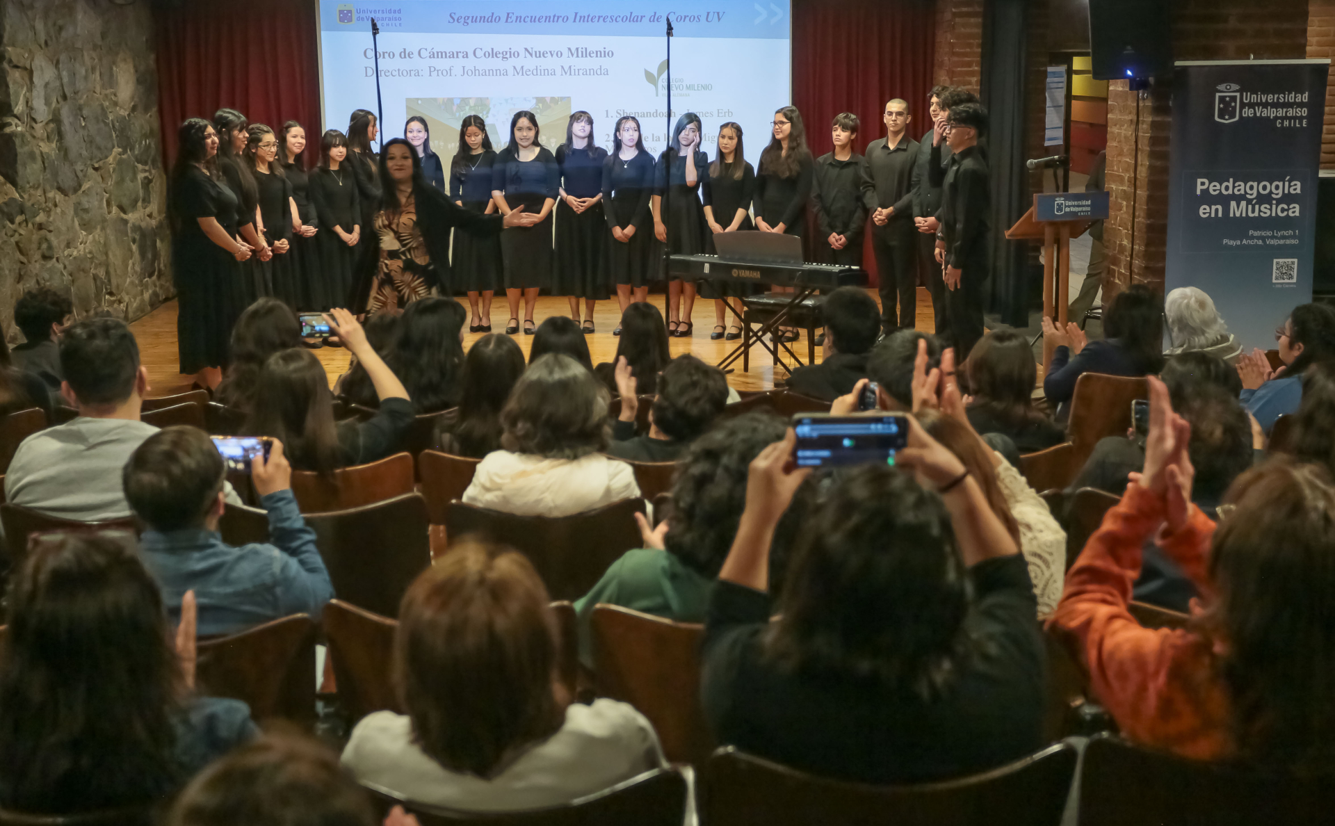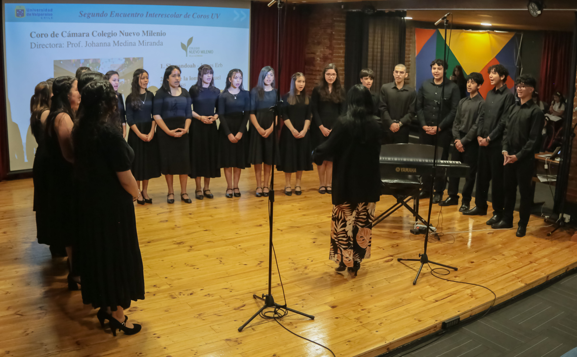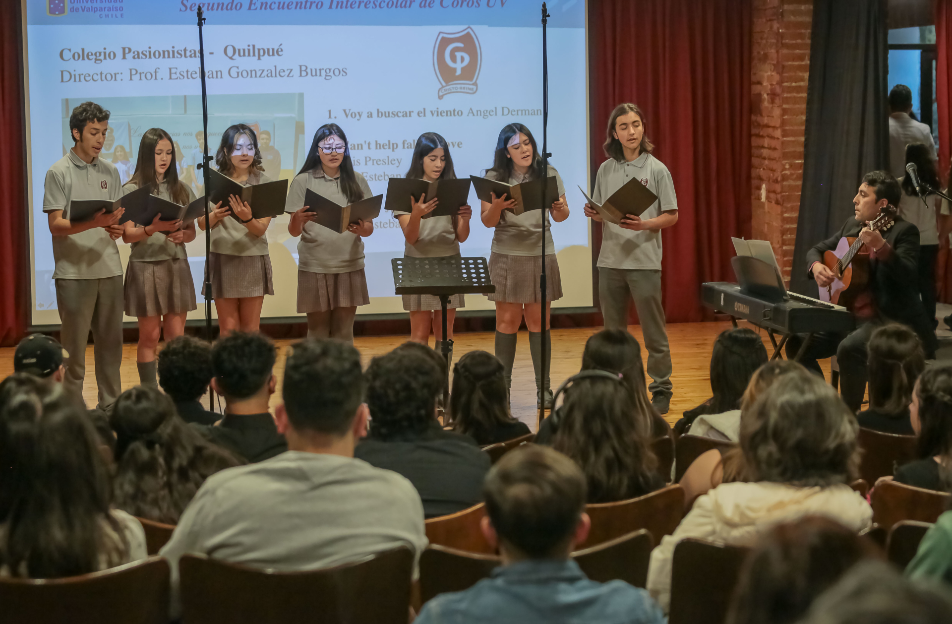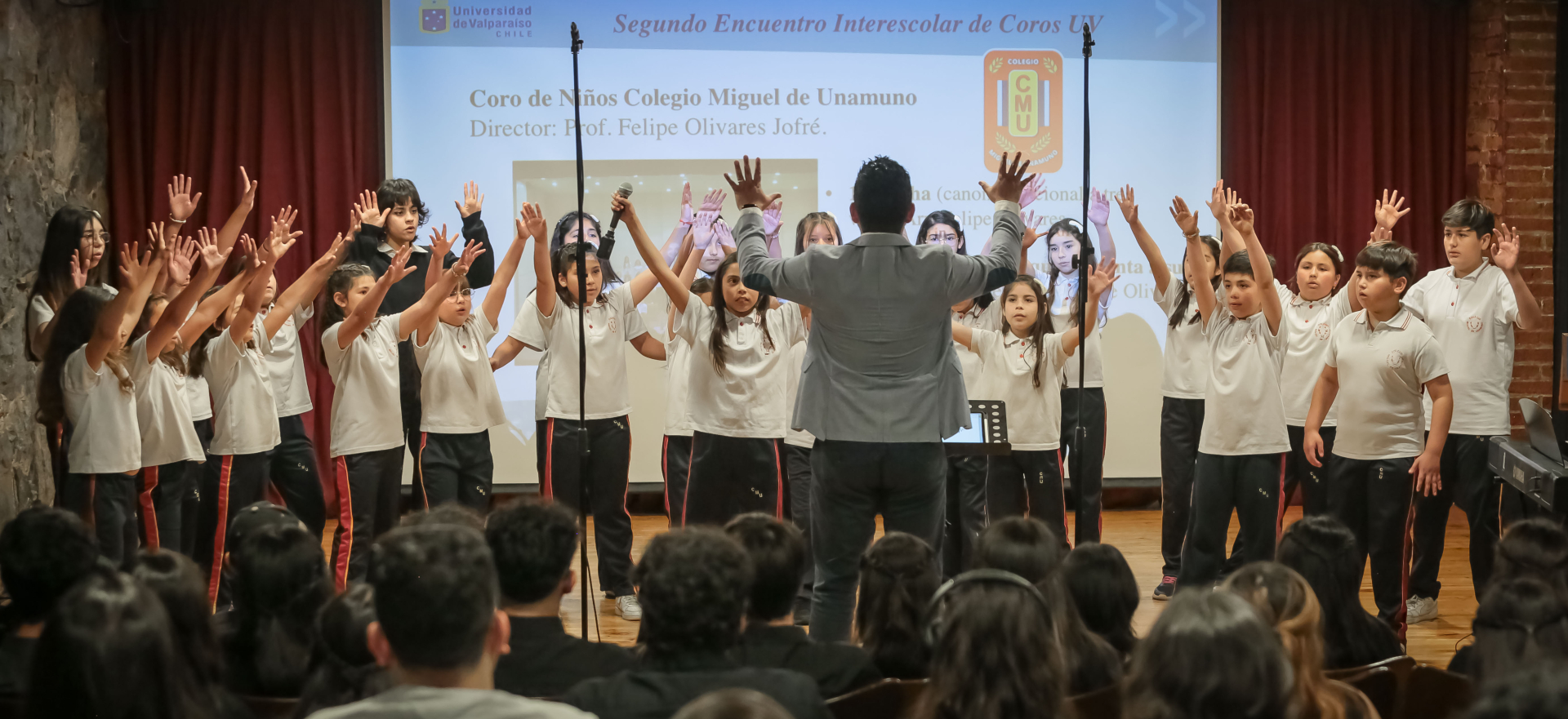 En la sala Rubén Darío del Centro de Extensión UV se desarrolló el Segundo Encuentro Interescolar de Coros, actividad organizada por la carrera de Pedagogía en Música de la Universidad de Valparaíso, y que este año contó con la participación de cuatro agrupaciones corales, que representaron al Colegio Miguel de Unamuno, el Colegio Guardiamarina Riquelme, el Colegio Pasionistas de Quilpué y el Colegio Nuevo Milenio de Villa Alemana.