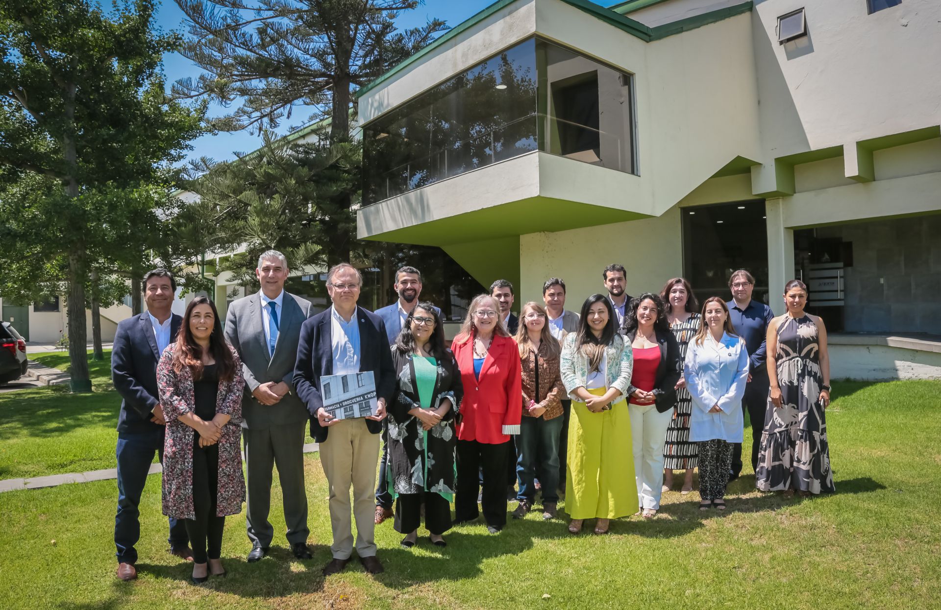 Participaron de la actividad el rector Osvaldo Corrales; la decana de la Facultad de Farmacia, Caroline Weinstein; el vicedecano Juan Ojeda; la directora general de Postgrado y Postítulo, Angélica Mosqueda; la directora de la Escuela de Química y Farmacia, Yanneth Moya; el director del Magíster en Bioactividad de Productos Naturales y de Síntesis, Daniel Moraga; junto a equipos de postgrado, extensión y vinculación, y autoridades de Knop Laboratorios, encabezadas por Olga Knop, Osvaldo Knop y Robert Knop, además del gerente general Marcelo Rojas y directivos de las áreas técnica, desarrollo e innovación.