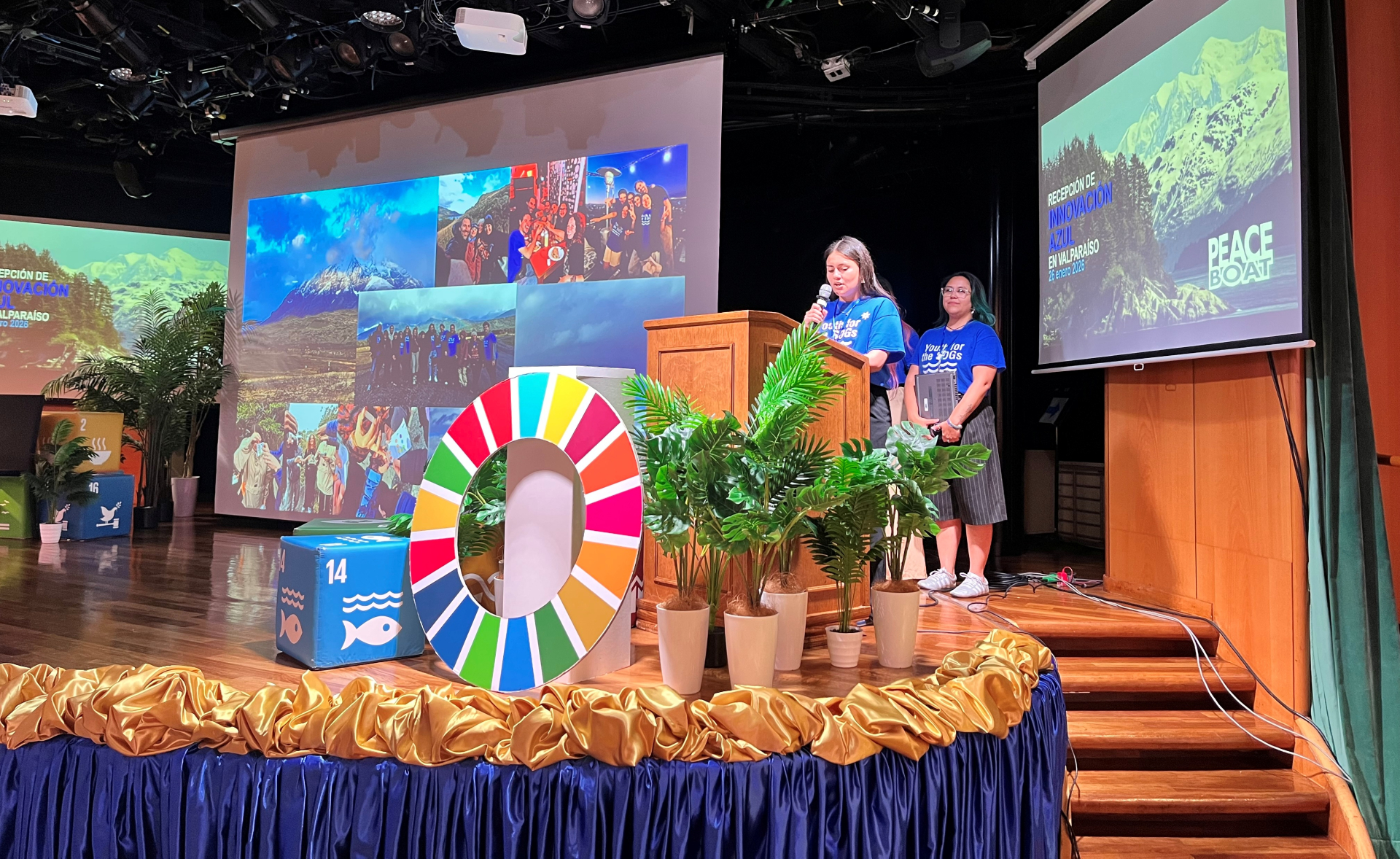 La participación de la UV incluyó a las estudiantes de Biología Marina Antonia Olivares y Catalina Santibáñez, quienes expusieron como embajadoras del programa “Jóvenes por los ODS”, compartiendo su experiencia tras haber viajado en el Barco de la Paz en su edición anterior.