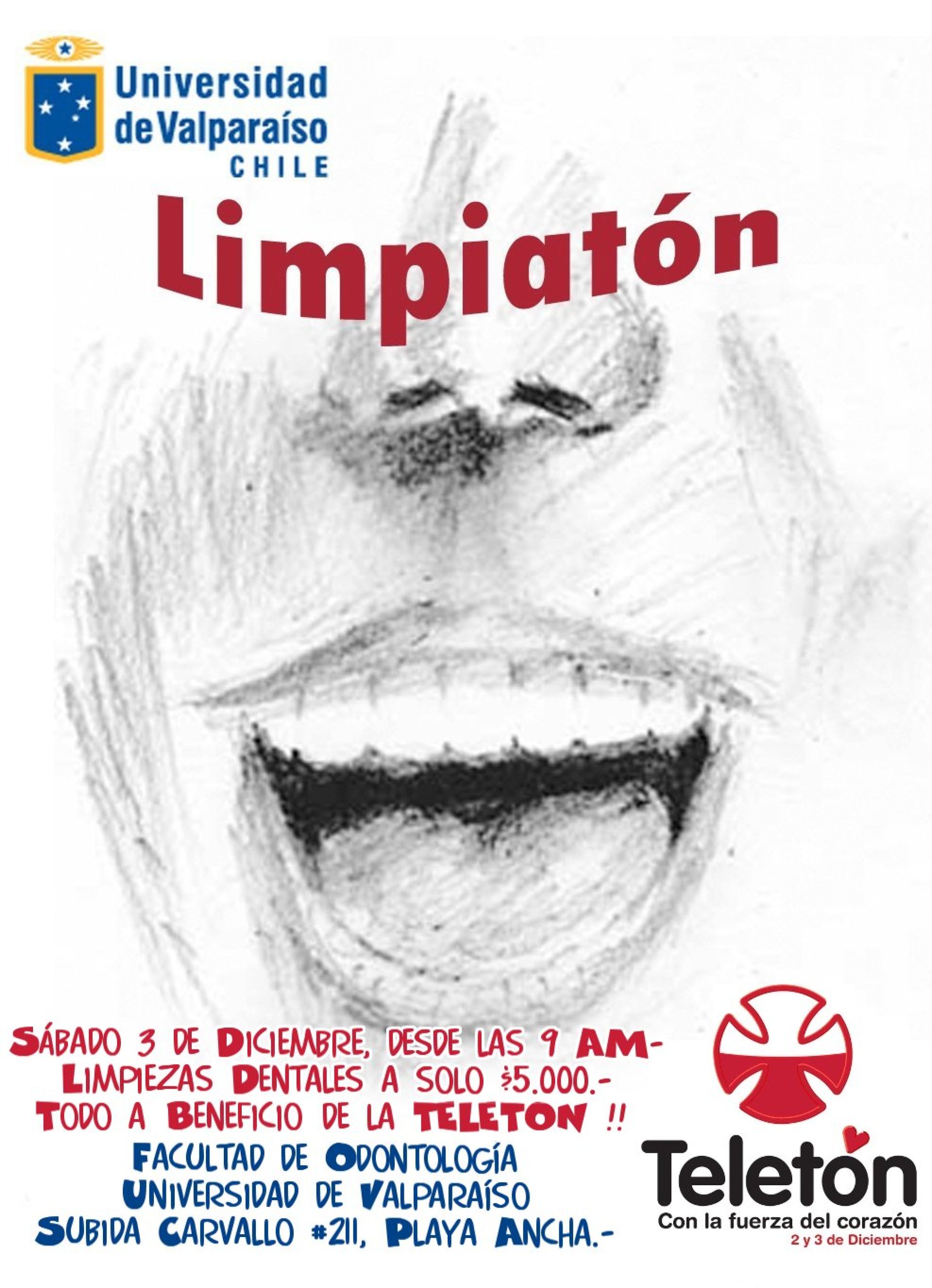 “Limpiatón” se llama la actividad con que la Escuela de Odontología de la Universidad de Valparaíso colaborará este año con la Teletón. Un total de treinta estudiantes de la carrera, bajo la supervisión de uno de sus académicos, atenderán público desde las nueve de la mañana, en las clínicas ubicadas en subida Carvallo 211, Playa Ancha.