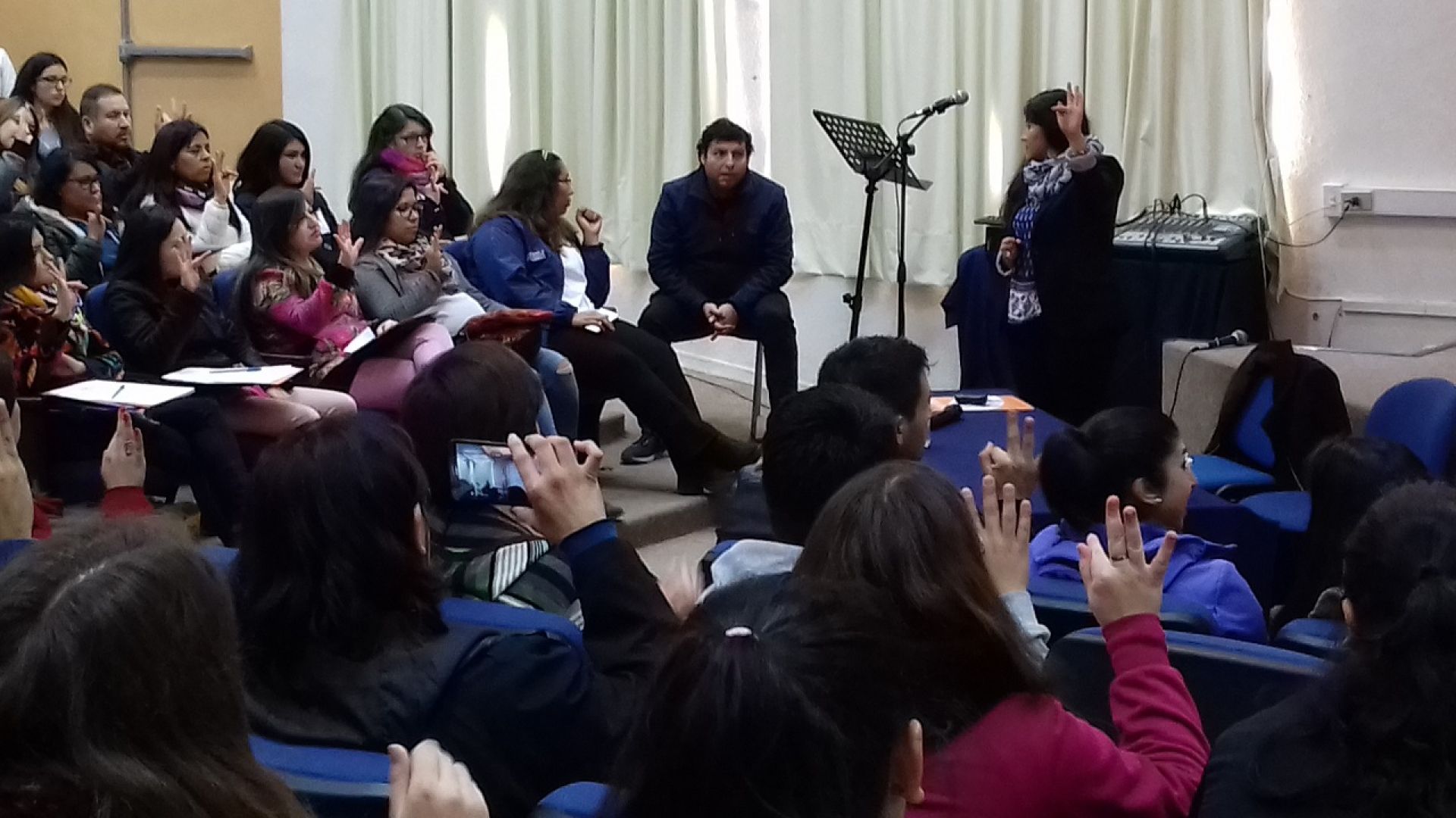 El segundo módulo de la jornada estuvo a cargo del equipo dirigido por Natalie Jaime y Gerson Jara, del Centro de Estudios y Capacitación de Sordos de Valparaíso, quienes montaron un “Taller de Iconicidad en Salud” con la activa participación del público presente, resaltando la importancia del concepto de iconicidad como expresión gestual, manual y facial que permite la comunicación con personas hablantes de otras lenguas, específicamente con personas sordas que utilizan el lenguaje de señas chileno.